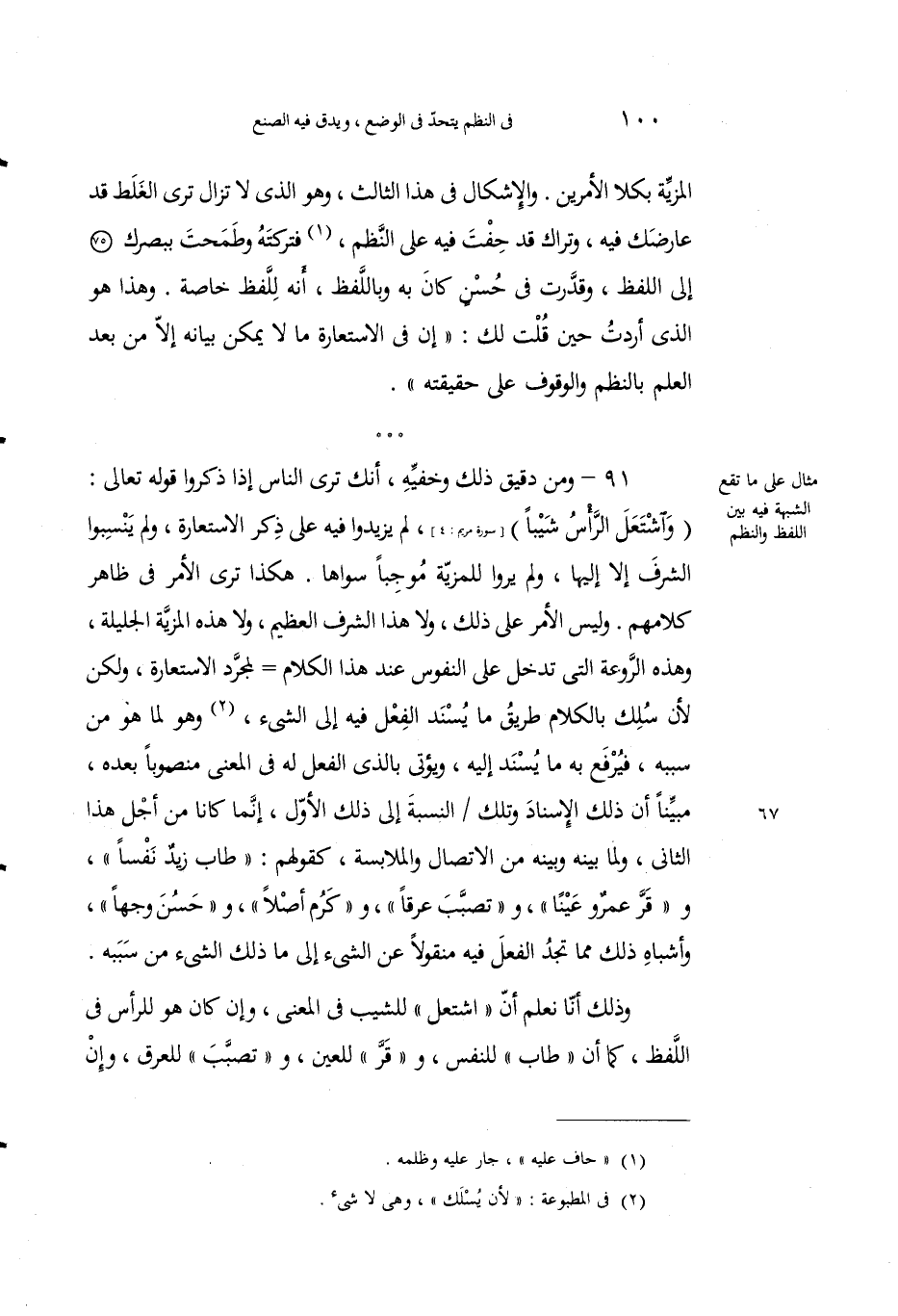91 - ومن دقيقِ ذلك وخَفِيِّه، أنكَ ترى الناسَ إِذا ذَكَروا قولَه تعالى: {وَاشْتَعَلَ الرَّأْسُ شَيْبًا} [مريم: 4]، لم يَزيدوا فيه على ذِكْرِ الاستعارةِ، ولم ينسبوا الشرف لا إِليها، ولم يَرَوا لِلمزيَّة مُوجِباً سِواها، هكذا ترى الأمر في ظ اهر كلامِهمْ. وليس الأَمرُ على ذلك، ولا هذا الشَّرفُ العظيمُ، ولا هذه المزيةُ الجليلةُ، وهذه الرَّوعةُ التي تدخلُ على النُّفوس عند هذا الكلامِ لمجرَّدِ الاستعارة، ولكن لأنْ سُلِك بالكلام طريقُ ما يسندُ الفعْلُ فيه إِلى الشيءِ2، وهو لِما هو من سَبَبِهِ، فيُرفعُ به ما يُسند إِليه، ويُؤتى بالذي الفعلُ له في المعنى منصوباً بَعده، مبيناً أنَّ ذلك الإِسنادَ وتلك النسبةَ إِلى ذلك الأولِ، إِنَّما كانا من أجلِ هذا الثاني، ولما بينَه وبينَه منَ الاتَّصالِ والملابسةِ، كقولهم: "طابَ زيدٌ نفساً"، و "قر عمرو عينًا"، و "تصبب عرقًا"، و "كرم أصلًا"، و "حسن وجْهاً" وأشباهِ ذلك مما تَجِد الفعلَ فيه منقولاً عن الشيء إِلى ما ذلك الشيءُ من سببهِ.