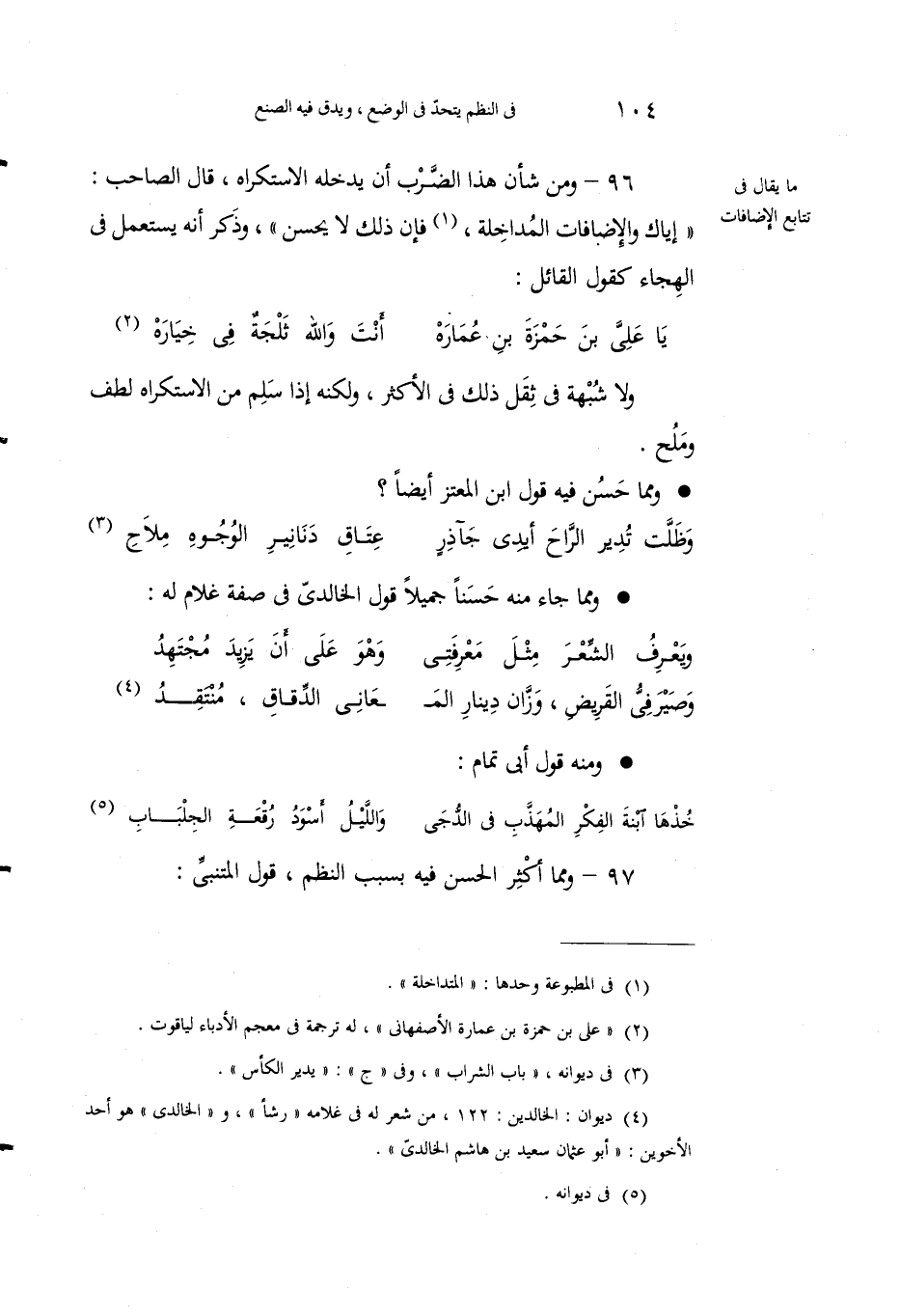 96 - ومِنْ شأنِ هذا الضربِ أن يَدْخلَه الاستكراهُ، قال الصاحبُ: "إياكَ والإضافاتِ المُتَداخلةَ1، فإنَّ ذلك لا يَحْسُن"، وذكَر أَنَّه يُستعملُ في الهجاء كقول القائل: