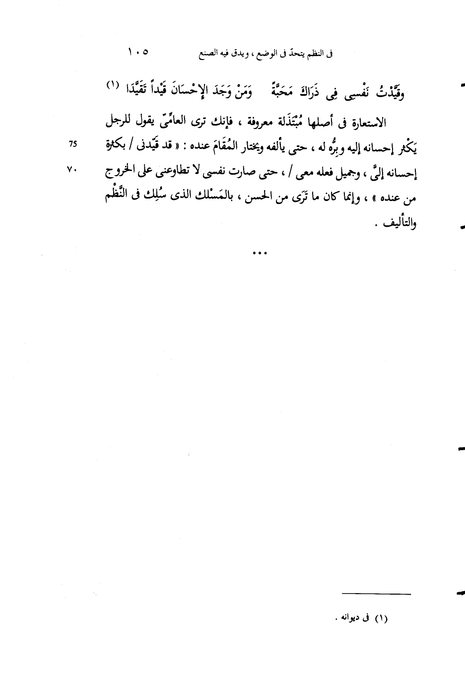 الاستعارةُ في أصْلها مُبْتذلة معروفةٌ، فإنَّك ترَى العاميَّ يقولُ للرجل يَكْثُر إحسانُه إِليه وَبرُّهُ له، حتى يألَفَه ويختارَ المقامَ عنده: "قد قيَّدني بكثرةِ إِحسانِه إليَّ، وجميلِ فِعْله معي، حتى صارتْ نَفسي لا تُطاوِعُني على الخروجِ من عنْدِه"، وإِنّما كان ما تَرى منَ الحُسْن، بالمَسْلك الذي سلَكَ في النظم والتأليف.