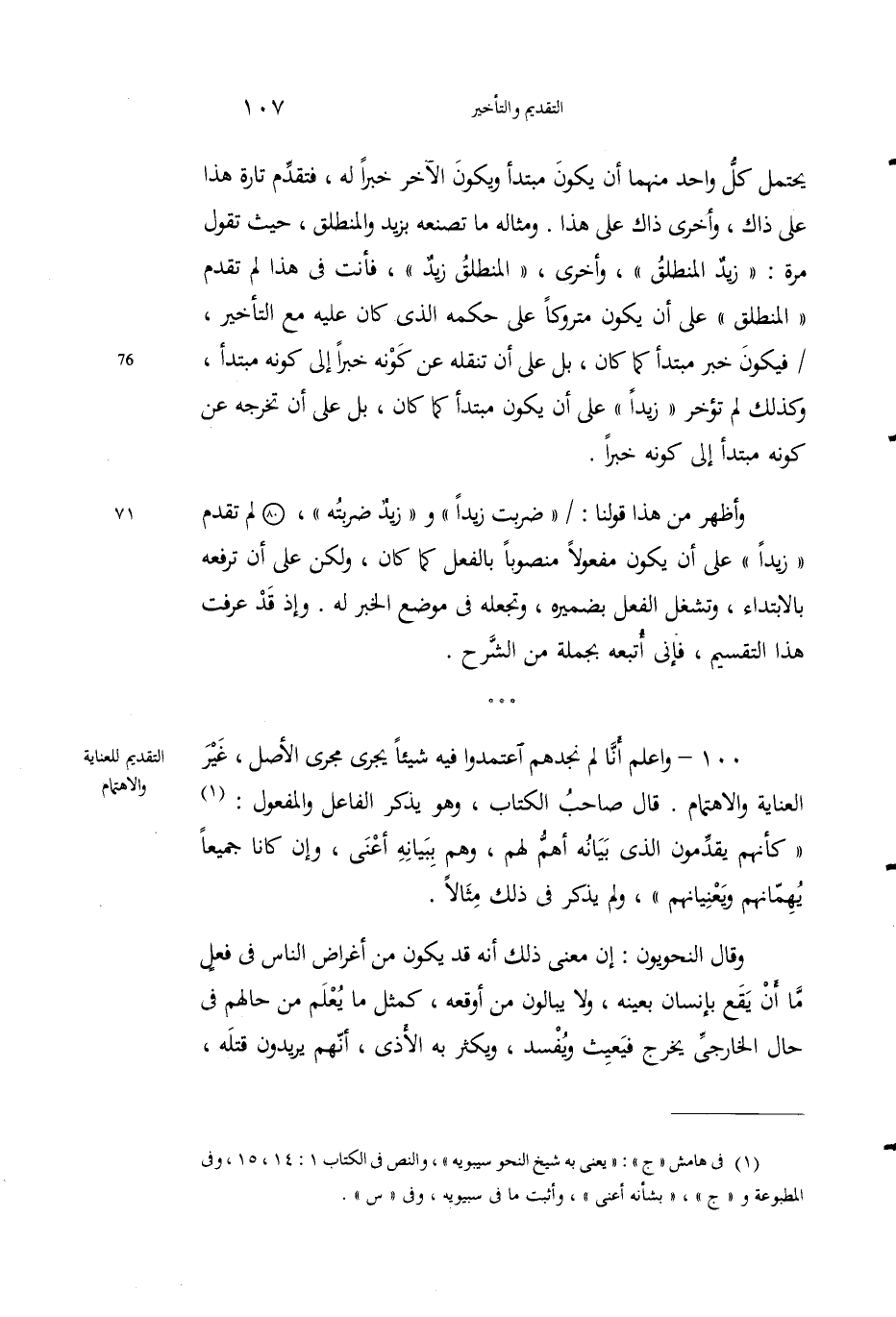 100 - واعلمْ أَنَّا لم نَجدْهُم اعْتَمدوا فيه شيئاً يَجري مَجرى الأَصْل، غيرَ العنايةِ والاهتمامِ. قال صاحبُ الكتاب، وهو يَذكُر الفاعلَ والمفعولَ1: "كأنَّهم يقدمون الذي بيانه أهم لهم، وهم ببيانه أَعْنى، وإِن كانا جميعاً يُهمَّانِهم ويَعْنيانِهم" ولم يَذْكر في ذلك مثالاً.