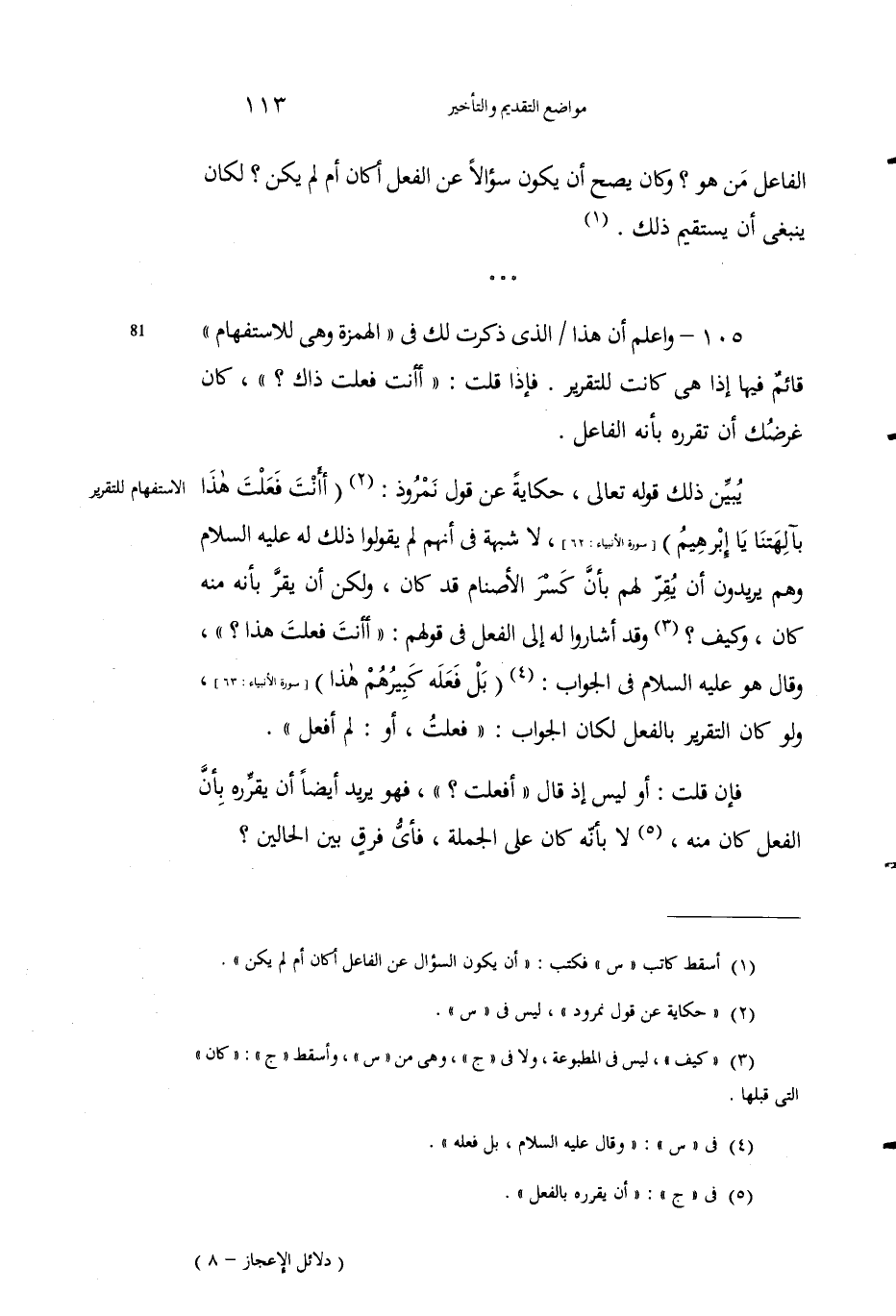 105 - واعلمْ أَنَّ هذا الذي ذكرتُ لك في "الهمزة وهي للاستفهام" قائمٌ فيها إِذا هيَ كانت للتقرير. فإِذا قلتَ: "أَأَنْتَ فعلتَ ذاك؟ "، كان غرضك أن تقرره بأنه الفاعل.