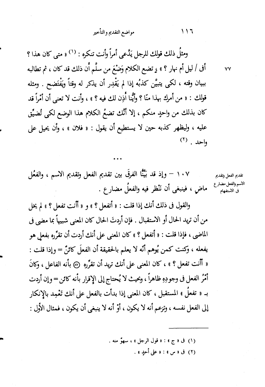 107 - وإِذ قد بينَّا الفَرْقَ بينَ تَقديمِ الفعلِ وتقديم الاسم، والفعلُ ماضٍ، فينبغي أن تنظر فيه والفعلُ مضارعٌ.