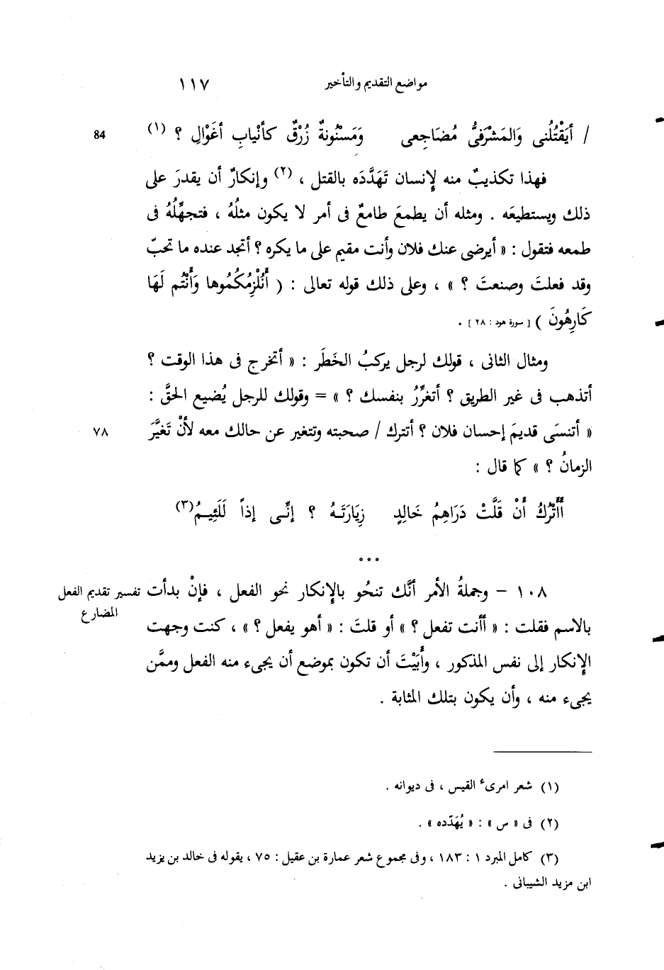 108 - وجملةُ الأمر أَنك تَنْحو بالإِنكارِ نَحْوَ الفعلِ، فإنْ بدأتَ بالاسمِ فقلتَ: "أأنتَ تَفعلِ؟ " أو قلتَ" "أهوَ يفعلُ؟ "، كنتَ وجَّهْتَ الإنكارَ إِلى نفسِ المذكورِ، وأبيْتَ أن تكونَ بموضعِ أَنْ يجيءَ منه الفعلُ وممن يجيءُ منه، وأن يكونَ بتلك المثابة.