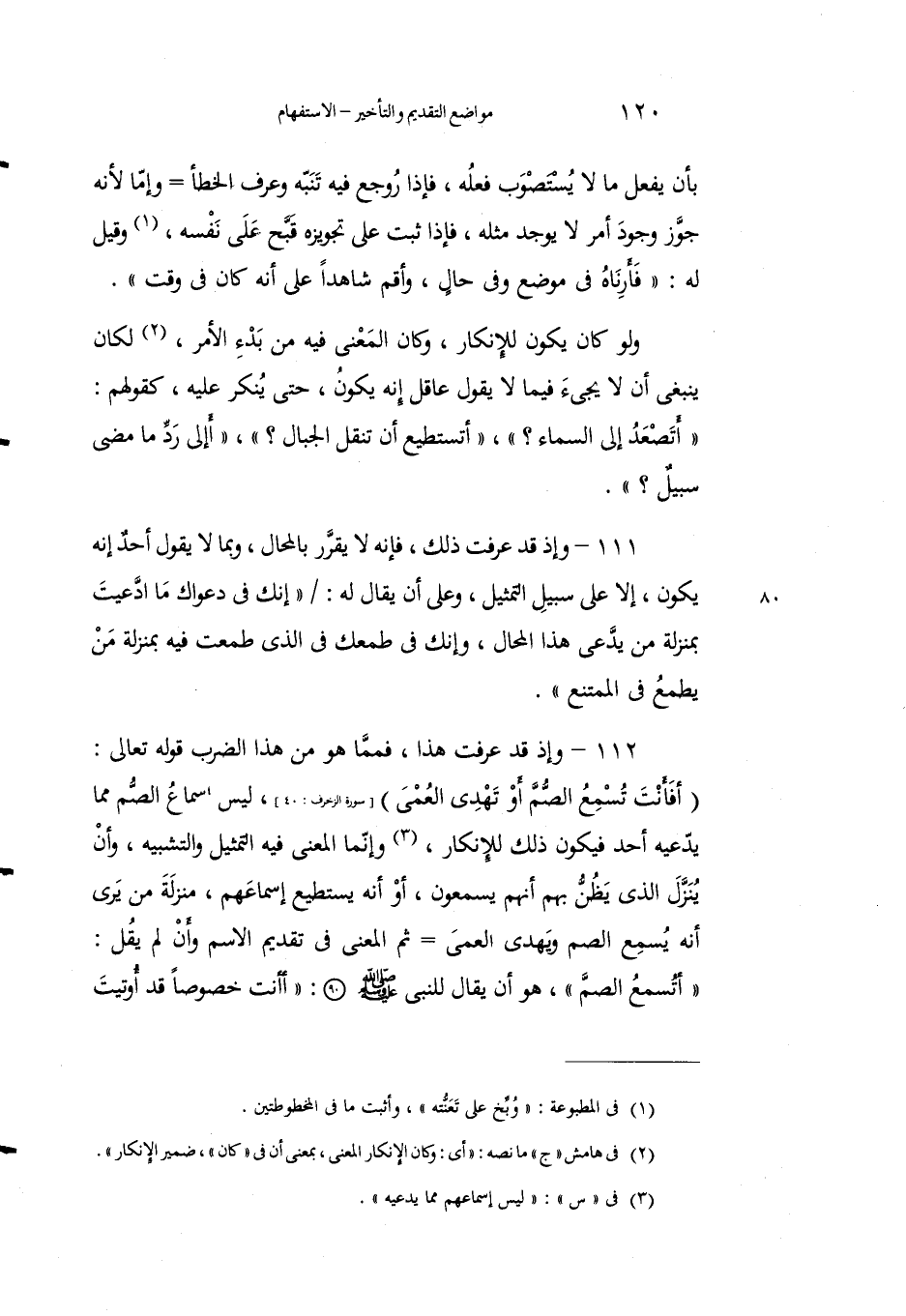 111 - وإذْ قد عرفْتَ ذلك، فإِنَّه لا يُقرِّر بالمُحال، وبما لا يقولُ أَحدٌ إِنه يكونُ، إلاَّ على سبيلِ التمثيلِ، وعلى أنْ يُقالَ له: "إنَّكَ في دَعْواك ما ادَّعَيْتَ بمنزلةِ مَنْ يَدَّعي هذا المُحال، وإنكَ في طَمَعك في الذي طمعْتَ فيه بمنزلةِ مَنْ يَطْمعُ في الممتنع".