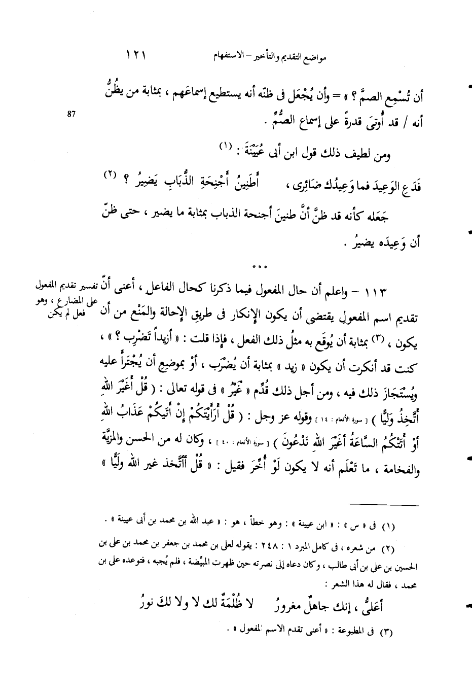 113 - واعلمْ أنَّ حالَ المفعولِ فيما ذكرنا كحالِ الفاعلِ، أعني تقديمَ إسمِ المفعول يَقتضي أنْ يكونَ الإنكارُ في طريق الإِحالة والمنعِ مِنْ أن يكونَ3، بمثابةِ أَنَّ يُوقَع به مثلُ ذلك الفعلُ، فإِذا قلْتَ: "أزيداً تضربُ؟ "، كنتَ قد أَنكرْتَ أن يكونَ "زيدٌ" بمثابة أن يُضرَبَ، أَو بموضعٍ أن يُجْترأَ عليه ويُسْتَجازَ ذلك فيه، ومِن أَجْل ذلك قُدِّمَ "غير" في قولهِ تعالى: {قُلْ أَغَيْرَ اللَّهِ أَتَّخِذُ وَلِيًّا} [الأنعام: 14] وقولهِ عزَّ وَجَلَ: {قُلْ أَرَأَيْتَكُمْ إِنْ أَتَاكُمْ عَذَابُ اللَّهِ أَوْ أَتَتْكُمُ السَّاعَةُ أَغَيْرَ اللَّهِ تَدْعُونَ} [الأنعام: 40]، وكان له من الحُسْن والمزيَّة والفخامة، ما تَعلمُ أنه لا يكونُ لو أُخِّرَ فقيلَ: "قلْ أأتخذ غير الله وليًا".