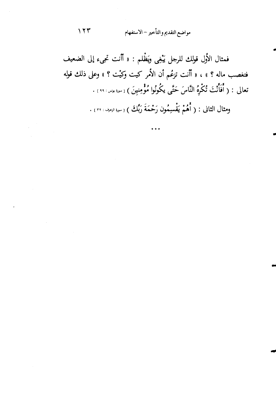 فمثالُ الأوَّلِ قولُك للرجل يَبْغي ويَظْلِمُ: "أَأنت تجيءُ إلى الضَّعيف فتغضبُ مالَه؟ "، "أأنتَ تَزْعُم أنَّ الأمرَ كَيْتَ وكَيتَ؟ " وعلى ذلك قولُه تعالى: {أَفَأَنْتَ تُكْرِهُ النَّاسَ حَتَّى يَكُونُوا مُؤْمِنِين} [يونس: 99].