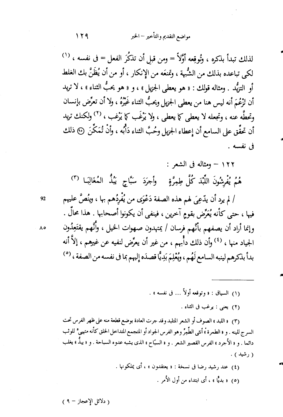 لذلك تبدأ بذِكْره، وتَوَقُّعِه أوّلاً ومِنْ قَبْلِ أن تَذكر الفعلَ في نفسه1، لكي تُباعِدَه بذلك من الشُّبْهة، وتَمْنعَه من الإِنكار، أَوْ مِنْ أن يُظَنَّ بك الغَلطُ أو التزيُّدُ. ومثالُه قولُك: "هو يعطي الجزيل"، و "هو يُحبُّ الثناءَ"، لا تُريد أن تَزعم أنه ليس هنا مَنْ يُعطي الجزيلَ ويُحِبُّ الثناءَ غيرَهُ، ولا أن تُعرِّض بإنسانٍ وتحطَّه عنه، وتجعلَه لا يُعطي كما يُعْطي، ولا يَرْغَبُ كما يَرغب2، ولكنكَ تريدُ أن تُحقِّق على السامعِ أنَّ إعطاءَ الجزيل وحُبَّ الثناءِ دأْبُهُ، وأن تُمكِّن ذلك في نفسه.
