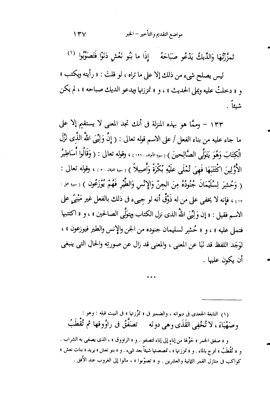 133 - ومما هو بهذهِ المنزلةِ في أنك تَجِدُ المعنى لا يستقيمُ إلاَّ على ما جاءَ عليه من بناءِ الفعلِ على الاسم قولُه تعالى: {إِنَّ وَلِيِّيَ اللَّهُ الَّذِي نَزَّلَ الْكِتَابَ وَهُوَ يَتَوَلَّى الصَّالِحِينَ} [الأعراف: 196]، وقولُه تعالى: {وَقَالُوا أَسَاطِيرُ الْأَوَّلِينَ اكْتَتَبَهَا فَهِيَ تُمْلَى عَلَيْهِ بُكْرَةً وَأَصِيلًا} [الفرقان: 5]، وقولُه تعالى: {وَحُشِرَ لِسُلَيْمَانَ جُنُودُهُ مِنَ الْجِنِّ وَالْأِنْسِ وَالطَّيْرِ فَهُمْ يُوزَعُونَ} [النمل: 17]، فإِنَّه لا يَخْفى على مَنْ له ذوقٌ أَنه لاو جيءَ في ذلك بالفِعْل غيْرَ مَبْنيِّ على الاسم فقيلَ: {إِنَّ وَلِيِّيَ اللَّهُ الَّذِي نَزَّلَ الْكِتَابَ وَهُوَ يَتَوَلَّى الصَّالِحِينَ}، و {اكْتَتَبَهَا فَهِيَ تُمْلَى عَلَيْهِ}، و {وَحُشِرَ لِسُلَيْمَانَ جُنُودُهُ مِنَ الْجِنِّ وَالْأِنْسِ وَالطَّيْرِ فَهُمْ يُوزَعُونَ}، لوَجِدَ اللفظُ قد نَبَا عنِ المعنى، والمعنى قد زالَ عن صورتِه والحالِ التي يَنْبغي أن يكون عليها.