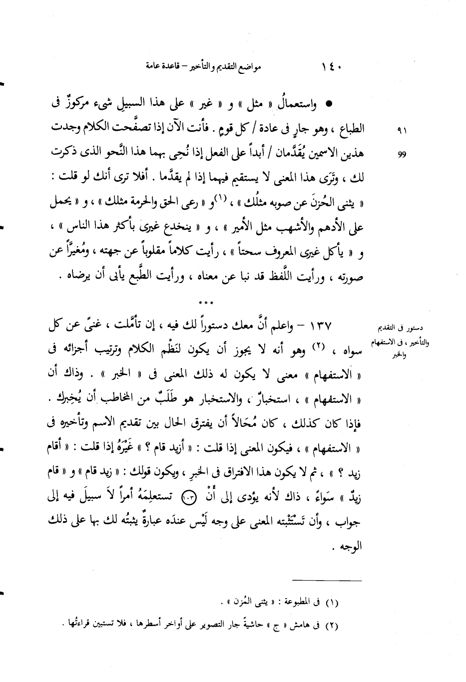 137 - واعلمْ أنَّ معَكَ دُستوراً لك فيه، إنْ تأملت، غني عن كل سِواهُ1، وهو أَنه لا يَجوز أن يكونَ لِنَظْم الكلامِ وتَرتيبِ أَجزائه في "الاستفهام" معنًى لا يكونُ لهُ ذلكَ المعنى في "الخبر". وذاكَ أنَّ "الاستفهامَ" استخبارٌ، والاستخبارَ هوُ طَلبٌ منَ المُخاطَب أن يُخْبرك. فإِذا كان كذلك، كان مُحالاً أن يَفْترِقَ الحالُ بينَ تقديمِ الاسمِ وتأخيرهِ في "الاستفهامِ"، فيكونُ المعنى إذا قلتَ: "أزيدٌ قام؟ " غيرَهُ إذا قلتَ: "أقامَ زيدٌ؟ "، ثم لا يكونُ هذا الافتراقُ في الخَبر، ويكونُ قولُك: "زيدٌ قام" و "قامَ زيدٌ" سواءً، ذاكَ لأنه يؤدِّي إلى أَنْ تستعملَه أمراً لا سبيلَ فيه إلى جوابٍ، وأن تَسْتَثْبِتَه المعنى على وجهٍ ليس عنده عبارةٌ يثبتُه لكَ بها على ذلك الوجه.