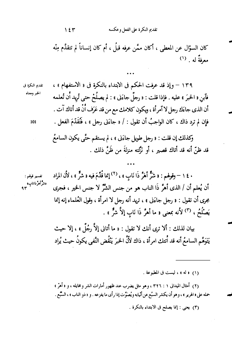 139 - وإذْ قد عرفتَ الحكْم في الابتداءِ بالنَكرةِ في "الاستفهام" فأين "الخَبرَ" عليه. فإِذا قلتَ: "رجلٌ جاءَني": لم يَصْلُح حتى تُريدَ أَن تُعلِمَه أنَّ الذي جاءك رجلٌ لا امرأة، ويكونُ كلامُكَ مع مَن قد عَرَف أنْ قد أتاكَ آتٍ. فإِن لم تُرد ذاك، كان الواجبُ أن تقولَ: "جاءَني رجلٌ"، فَتقَدِّمَ الفعلَ.