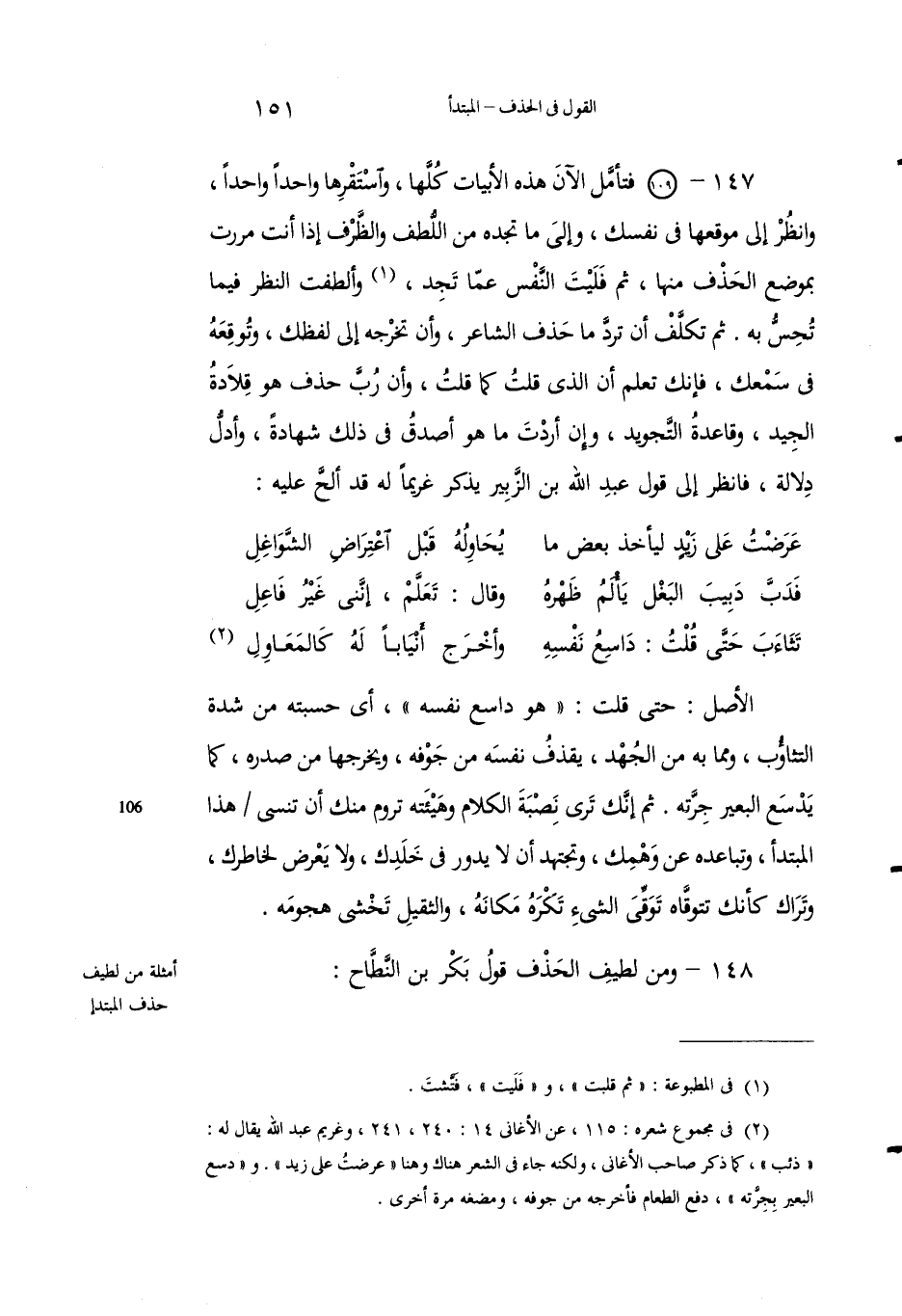 147 - فتأمَّل الآنَ هذه الأبياتَ كلَّها، واسْتَقْرِها واحداً واحداً، وانظرْ إلى مَوقِعها في نفسِك، وإلى ما تَجدُه مِنَ اللطفِ والظَّرْفِ إذا أنتَ مررت بموضع الحذف منها، ثم فليت النفسَ عما تَجدُ1، وأَلْطفْتَ النظَرَ فيما تُحِسُّ به. ثُمَّ تَكلَّفْ أَن تَرُدَّ ما حذَفَ الشاعرُ، وأن تُخرجَه إلى لفظِك، وتُوقِعَه في سمعكَ، فإِنك تَعلمُ أنَّ الذي قلتُ كما قلتُ، وأنْ رُبَّ حَذْفٍ هو قِلادَةُ الجِيد، وقاعدةُ التَّجويد، وإنْ أردتَ ما هو أَصْدقُ من ذلك شهادةً، وأدلُّ دلالةً، فانظرْ إلى قولِ عبدِ الله بنِ الزَّبير يذكُر غريماً له قد ألح عليه: