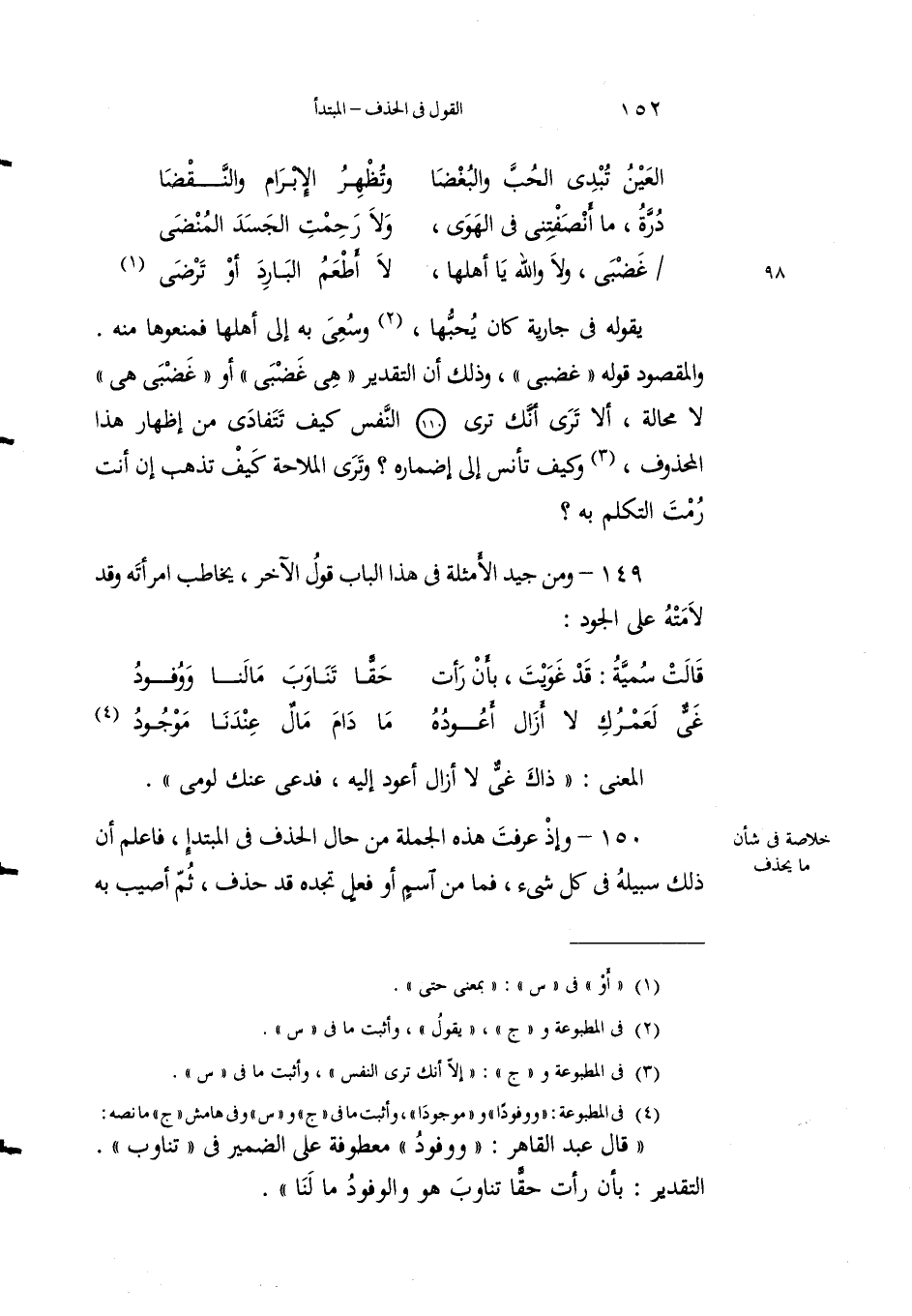 150 - وإذ عرفْتَ هذه الجملةَ من حالِ الحذْفِ في المبتدأ، فاعلمْ أنَّ ذلك سبيلُه في كلِّ شيء، فما مِن اسْمٍ أو فعلٍ تَجدُه قد حُذِفَ، ثم أُصيبَ به موضعُه، وحُذِفَ في الحال يَنْبغي أن يُحذَفَ فيها5، إلاَّ وأنت تَجدُ حذْفَه هناك أَحْسَنَ من ذكرهِ، وترة إضمارَهُ في النفس أَوْلى وآنسَ مِنَ النُّطْقِ به.
