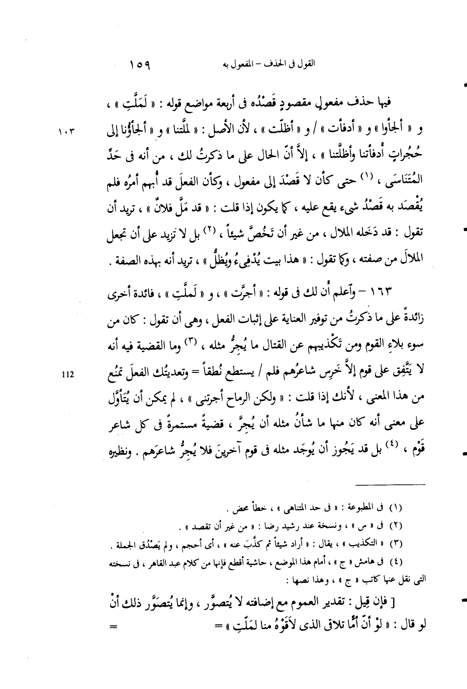 163 - واعلمْ أنَّ لك في قوله: "أجرت"، و "لملت"، فائدةَ أُخرى زائدةً على ما ذكْرتُ من توفير العناية على إثبات الفعلِ، وهي أن تقولَ: كانَ مِن سُوءِ بَلاءِ القوم ومِنْ تَكْذيبهم عن القتالِ ما يُجِرُّ مثْلَه3، وما القضيةُ فيه أنه لا يُتَّفَق على قومٍ إلا خَرَس شاعرُهم فلم يَسْتطعْ نطْقاً وتَعْديتُك الفعلَ تَمنُع مِن هذا المعنى، لأنكَ إذا قلتَ: "ولكنَّ الرماحَ أَجرَّتْني"، لم يُمكن أن يتأَوَّل على معنى أَنه كان منها ما شأنُ مِثْلِه أن يُجِرَّ، قضيةً مستمرةً في كلِّ شاعرِ قومٍ4، بل قد يجوزُ أن يُوجَدَ مثلُه في قومٍ آخرين فلا يُجَرُّ شاعرهم. ونظيره