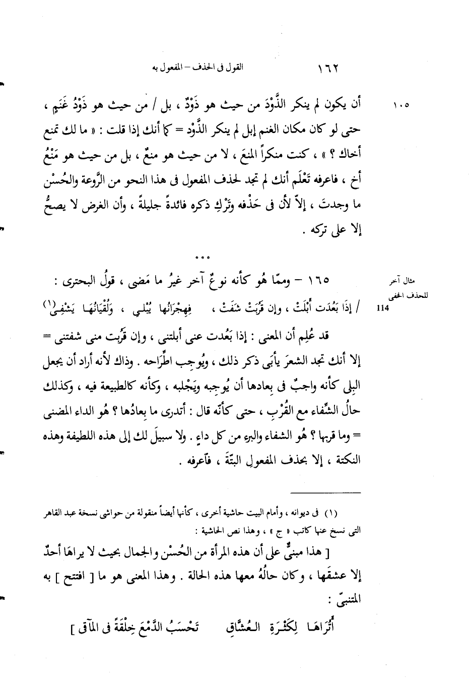 قد عُلِمَ أنَّ المعنى: إذا بَعُدَتْ عني أَبْلَتني، وإنْ قَرُبَتْ مني شفَتْني إلاَّ أَنك تَجِدُ الشعرَ يأبى ذِكْرَ ذلك، ويُوجِبُ أطِّراحَه. وذاك لأَنَّه أرادَ أن يَجْعلَ البِلى كأنه واجِبٌ في بِعادها أن يُوجِبَه ويَجْلبه، وكأَنَّه كالطَّبيعة فِيه، وكذلك حالُ الشفاءِ معَ القُرب، حتى كأنه قال: أتدري ما بِعادُها؟ هو الداءُ المُضْني وما قُرْبُها؟ هو الشفاءُ والبُرْءُ مِنْ كلِّ داءٍ. ولا سبيلَ لك إلى هذه اللطيفةِ وهذه النكْتة، إلا بحذف المفعول البتة، فاعرفه.