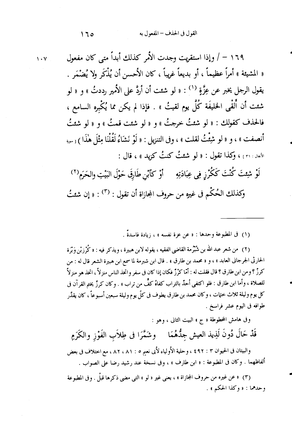 يقول الرجل يخبر عن عزة1: "لو شئتُ أَن أَردَّ على الأميِر ردَدْتُ" و "لو شئتُ أنْ أَلْقى الخليفَةَ كلَّ يومٍ لَقِيتُ". فإذا لم يكن مما يُكْبِرُهُ السامعُ، فالحذفُ كقولك: "لو شئت خرجت" و "لو شئت قمت" و "لو شئت أنصفت"، و "لو شئتُ لقلت"، وفي التنزيلِ: {لَوْ نَشَاءُ لَقُلْنَا مِثْلَ هَذَا} [الأنفال: 31]، وكذلك تقول: "لو شئت كنت كزيد"، قال: