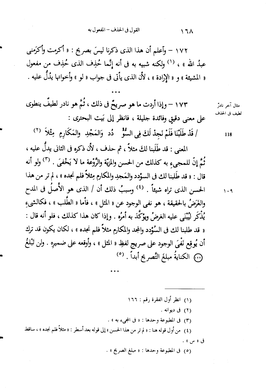 172 - واعلمْ أنَّ هذا الذي ذكَرْنا ليس بصريحٍ: "أكرمت وأكرمني عبد الله"1 لكنه شبيهٌ به في أنه إنَّما حُذِفَ الذي حذف من مفعول "المشيئة" و "الإرادة"، لن الذي يأتي في جوابِ "لو" وأخَواتها يدلُّ عليه.