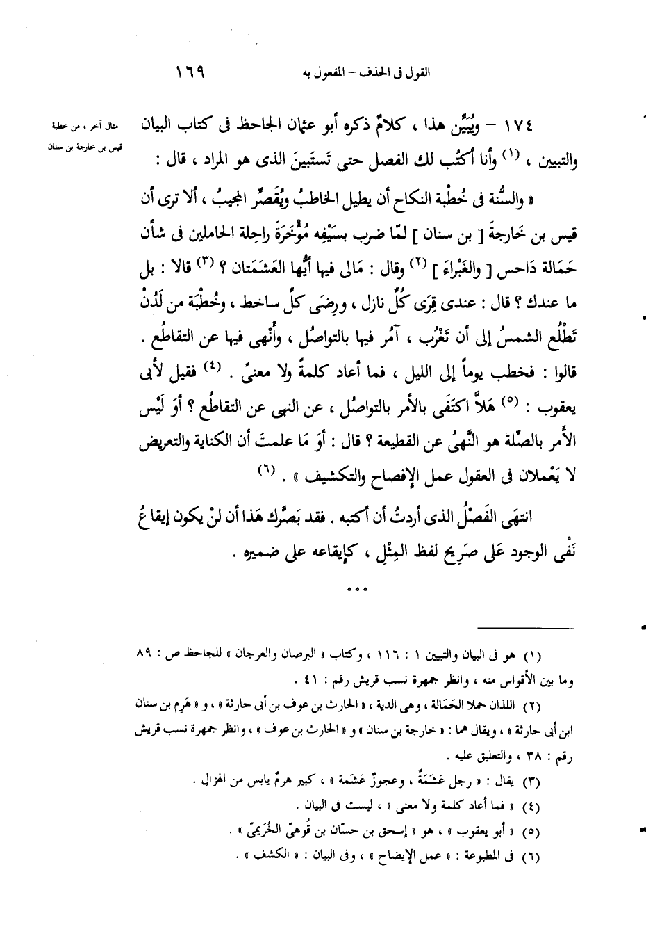 174 - ويُبيِّن هذا، كلامٌ ذكَرَه أبو عثمانَ الجاحظُ في كتاب البيان والتبيين1، وأنا أكتبُ لك الفصل حتى تستبين الذي هو المُرادُ، قال: "والسنَّةُ في خُطبِة النِّكاحِ أنْ يُطيلَ الخاطِبُ ويُقصِّرَ المجِيبُ، ألا ترى أن قيس بن خارجة [بن سنان] لمَّا ضرَبَ بسيفِه مُؤخَّرةَ راحلةِ الحاملَين في شأن حمالة داحس [والغبراء] 2 وقال: مالي فيها أيُّها العَشَمتَانِ؟ 3 قالا: بل ما عندَك؟ قال: عندي قِرى كلِّ نازلٍ، ورضِى كلِّ ساخِطٍ، وخُطبةٌ مِنْ لَدُنْ تطْلُعُ الشمسُ إلى أن تَغْرُبَ، آمرُ فيها بالتَّواصُل، وأَنْهى فيها عنِ التَّقاطُع قالوا: فخطَبَ يوماً إلى اللَّيل، فما أعاد كلمةً ولا معْنى4. فقيلَ لأبي يعقوب5: هلاَّ اكْتَفى بالأمِر بالتواصلِ، عنِ النَّهْي عن التقاطع؟ أو ليس الأمرُ بالصلةِ هو النهْيُ عن القطيعة؟ قال: أو ما علمْتَ أنَّ الكنايةَ والتعريضَ لا يَعْملان في العقولِ عَمَلَ الإِيضاح والتَّكشيفِ"6.انتهى الفصْلُ الذي أَردتُ أن أَكْتبَه. فقد بصَّرك هذا أنْ لن يكونَ إيقاعُ نَفْي الوجودِ على صَريحِ لفظِ المِثل، كإيقاعهِ على ضَمِيره.