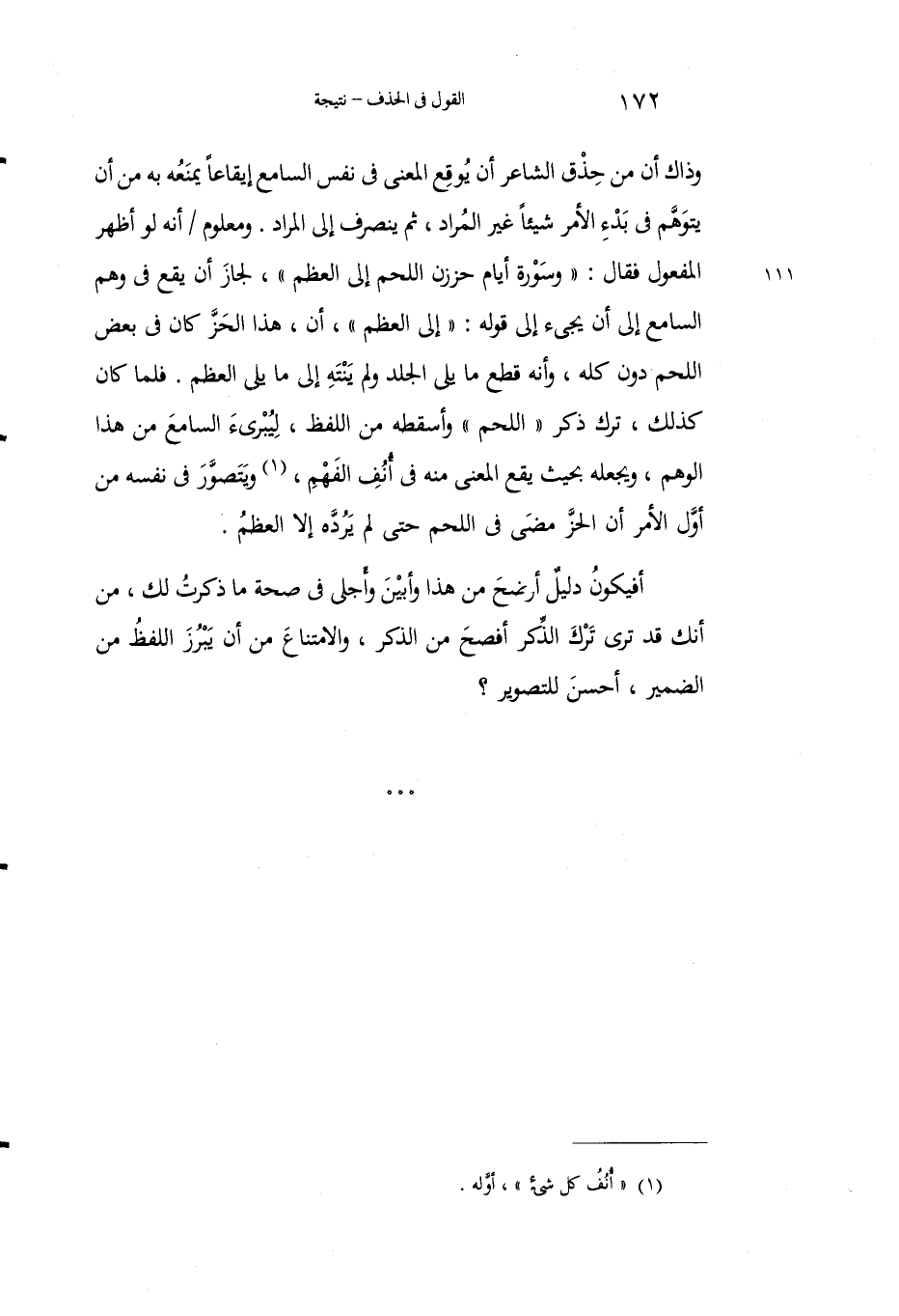 وذاك أنَّ مِنْ حِذْق الشاعرِ أَنْ يُوقِعَ المعنى في نَفْس السامعِ إيقاعاً يَمنعُه به مِنْ أنْ يتوَهَّم في بدءِ الأمر شيئاً غيرَ المرادِ، ثم ينصرفُ إلى المرادِ، ومعلومٌ أنه لو أظْهَر المفعولَ فقال: "وسَوْرة أيامٍ حززنَ اللَّحَم إلى العظم"، لجاز أن يقعَ في وَهْم السامع إلى أنْ يجيءَ إلى قولِه: "إلى العظم"، أنَّ، هذا الحزَّ كان في بعضِ اللحم دُونَ كلِّه، وأنه قطَعَ ما يَلي الجِلْدَ ولم يَنْتَهِ إلى ما يلي العظم. فلما كان كذلك، وترك ذِكْر "اللحم" وأَسْقَطَه من اللفظ، ليُبْرِئَ السامعَ من هذا الوهمِ، ويَجعلَهُ بحيثُ يَقعُ المعنى منه في أَنْفِ الفَهْمِ1، ويَتصوَّرُ في نفسه من أولِ الأمْر أنَّ الحزَّ مضى في اللحمِ حتى لم يَردَّه إلاَّ العْظمُ.