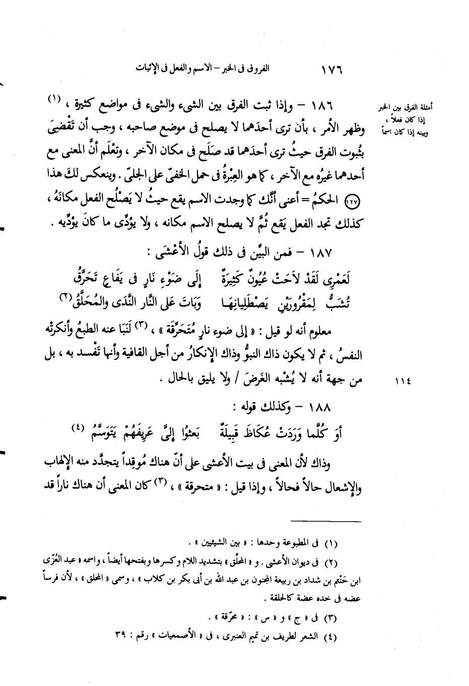 186 - وإذا ثبت الفرق بين الشيء والشيء في مواضعَ كثيرةٍ1، وظهرَ الأمرُ، بأَنْ تَرى أحدَهما لا يصْلُح في موضعِ صاحبهِ، وجَبَ أنْ تقضيَ بثُبوتِ الفرقِ حيثُ تَرى أَحدَهما قد صلُحَ في مكانِ الآخَرِ، وتَعْلَم أنَّ المعنى مع أحدِهما غَيرُهُ مع الآخرِ، كما هو العبرةُ في حَمْل الخَفيِّ على الجليِّ. وينعكسُ لك هذا الحكمُ أَعني أنك كما وجدْتَ الاسمَ يقَعُ حيثُ لا يَصلُح الفعلُ مكانه، كذلك نجد الفِعْلَ يَقَعُ ثُم لا يَصلُحُ الاسمُ مكانَه، ولا يؤدِّي ما كانَ يؤديه.