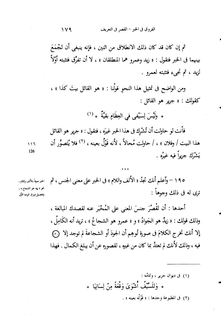 فأنتَ لو حاولتَ أن تُشْرك في هذا الخبرِ غيرَه، فتقولُ: "جريرٌ هو القائلُ هذا البيتَ وفلانٌ"، حاولت محالًا، لأنه قول بعينِه2، فلا يُتصوَّر أن يُشرَكَ جريراً فيه غيره.
