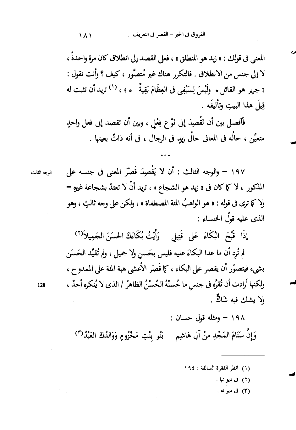 197 - والوجه الثالث: أن لا يَقصد قصْرَ المعنى في جنسِه على المذكورِ، لا كما كان في "زيدٌ هو الشجاعُ"ـ تُريد أن لا تعتدَّ بشجاعةِ غيرهِ ولا كما تَرى في قولِه: "هُو الواهبُ المئةَ المصطفاةَ"، ولكن على وجهٍ ثالثٍ، وهو الذي عليه قولُ الخنساء: