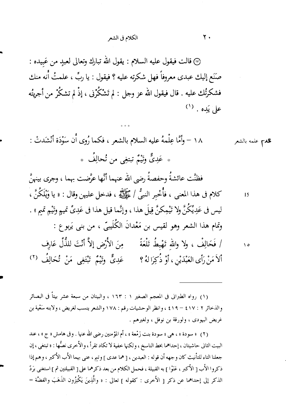 18 - وأمَّا عِلْمُه عليه السّلامُ بالشعرِ، فكَما رُويَ أنَّ سَوْدة أَنشدتْ: