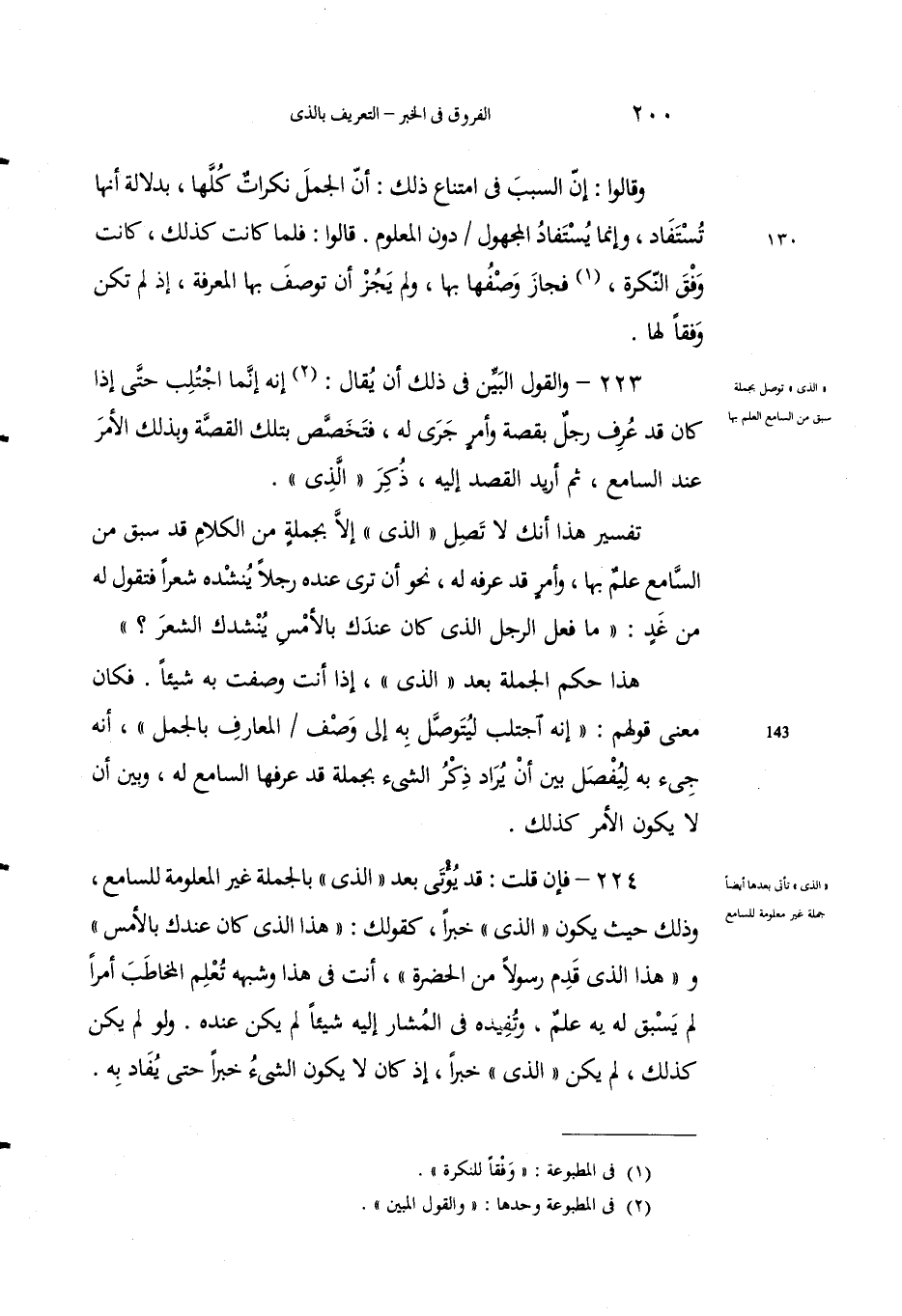 223 - والقول البين في ذلك أن يقالَ2: إنَّه إنَّما اجتُلِبَ حتى إذا كان قد عُرِفَ رَجلٌ بقصةٍ وأمْرٍ جَرى له، فتخصَّص بتلك القِصة وبذلك الأمِر عندَ السَّامعِ، ثم أُريدَ القصْدُ إليه، ذُكِرَ "الذي".