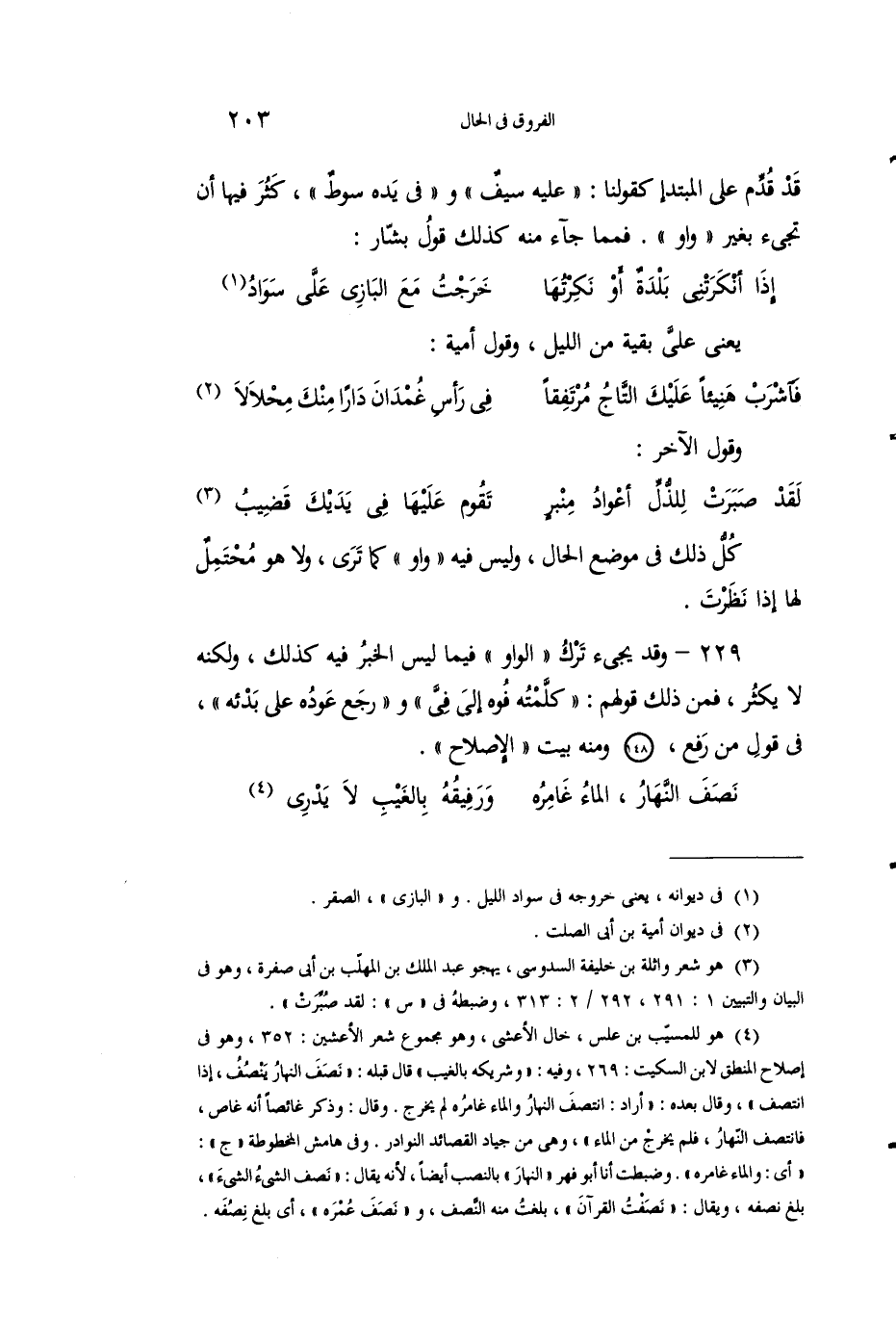 229 - وقد يجيءُ تَرْك "الواو" فيما ليس الخبرُ فيه كذلكَ، ولكنه لا يَكثُر، فمن ذلك قولهمُ: "كلَّمتُهُ فوهُ إلى فيَّ" و "رجَع عَوْدُهُ على بَدْئهِ"، في قولِ من رفعَ ومنه بيتُ "الإصلاح".