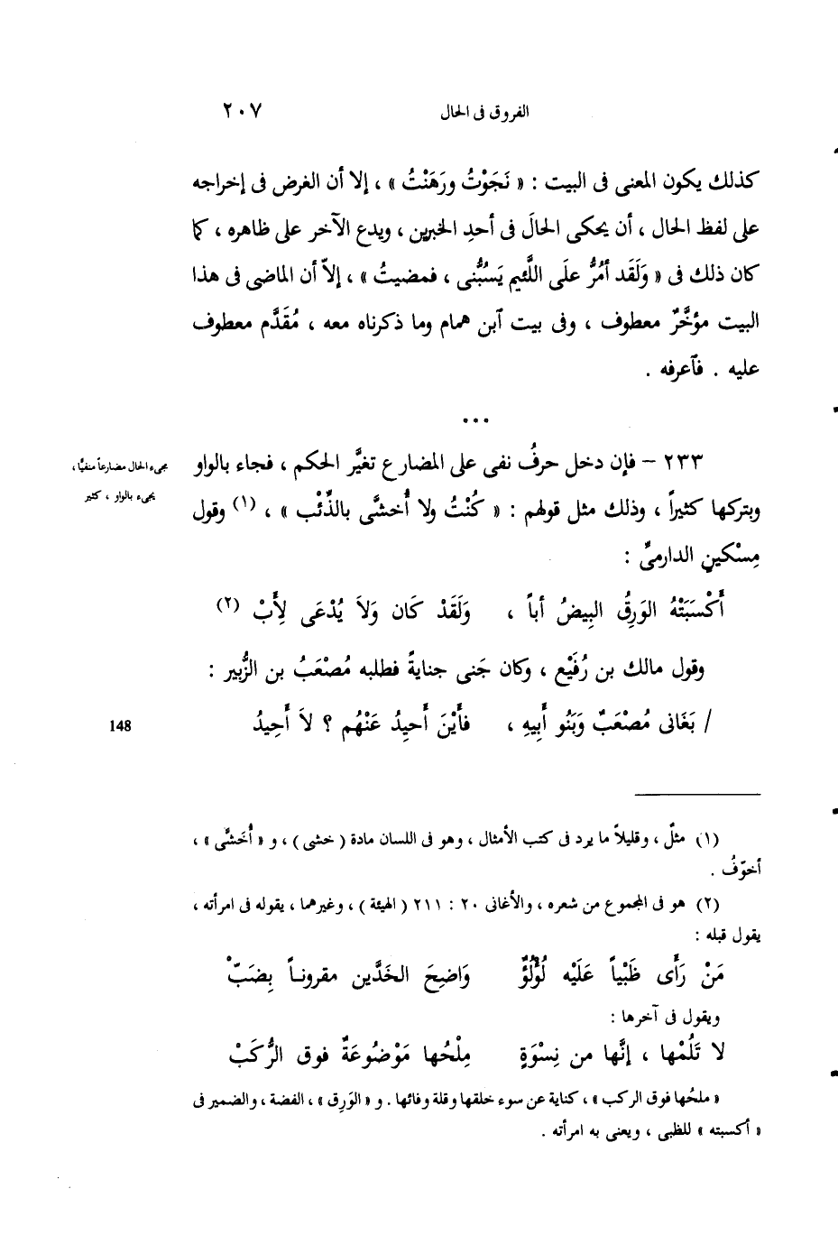233 - فإنْ دخَلَ حرفُ نَفْي على المضارع تغيَّر الحكْمُ، فجاءَ بالواوِ وبِتَرْكِها كثيراً، وذلك مثلُ قولِهم: "كنتُ ولا أُخَشَّى بالذئبِ"1، وقولِ مسكين الدارمي: