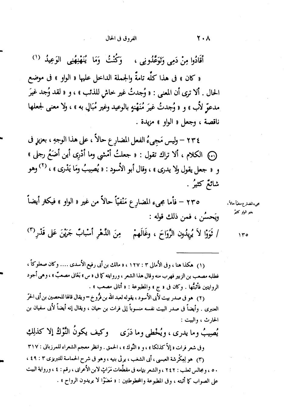 234 - وليس مجيءُ الفعل المضارعِ حالاً، على هذا الوجه، بعزيزٍ في الكلام، ألا تَراك تقولُ: "جعلتُ أمشي وما أدري أين أضع رجلي" و "جعل يقول ولا يَدري"، وقال أبو الأسود: "يصيب وما يدري"2، وهو شائع كثير.