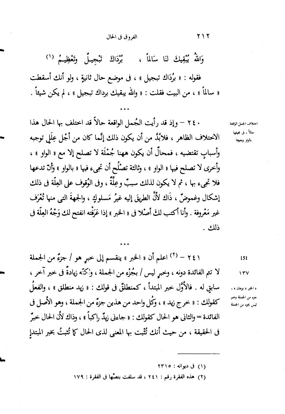 240 - وإذْ قد رأيتَ الجملَ الواقعةَ حالاً قد اختلفَ بها الحالُ هذا الاختلافَ الظاهرَ، فلا بُدْ من أن يكونَ ذلك إنَّما كان من أجل علل توجيه وأسبابٍ تقْتضيه، فمُحالٌ أن يكون ههنا جملةٌ لا تَصْلحُ إلاَّ مع "الواوِ"، وأخرى لا تَصْلحُ فيها "الواوُ"، وثالثةٌ تَصْلُحُ أن تجيءَ فيهأ "بالواو" وأنْ تَدَعَها فلا تجيءُ بها، ثم لا يكونُ لذلك سبَبٌ وعلَّة، وفي الوقوفِ على العلَّة في ذلك إشكالٌ وغُموضٌ، ذلك لأنَّ الطريقَ إليه غيرُ مسْلوكٍ، والجهةَ التي منها تعرف غير معروفة، وأن أكتبُ لك أصْلاً في "الخبرِ" إذا عرَفْتَه انفتح لك وجه العلة في ذلك.