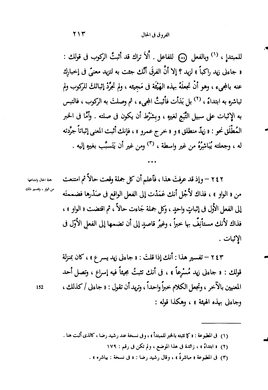 243 - تفسيرُ هذا: أَنك إذا قلْتَ: "جاءني زيدٌ يُسْرعُ"، كانَ بمنزلة قَوْلِك: "جاءني زيدٌ مُسرعاً"، في أنك تُثْبِتُ مَجيئاً فيه إسْراعٌ، وتَصِلُ أَحَد المعنَييْنِ بالآخَرِ، وتجعلُ الكلامَ خبراً واحداً، وتريدُ أن تقولَ: "جاءني كذلك، وجاءني بهذه الهيئة"، وهكذا قوله: