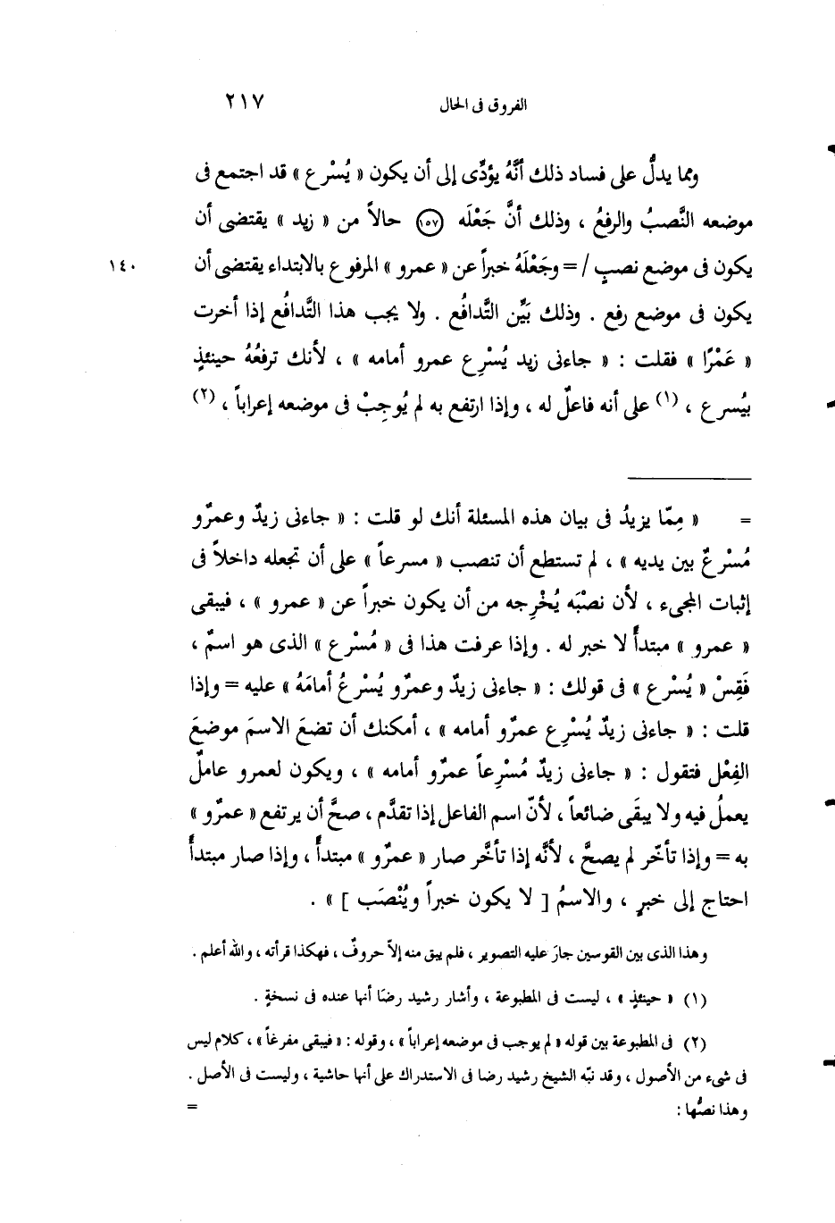 = "مما يزيد في بيان هذا المسئلة أنك لو قلت: "جاءني زيد وعمرو مسرع بين يديه"، لم تستطيع أن تنصب "مسرعًا" على أن تجعله داخلًا في إثبات المجيء، لأن نصبه يخرجه من أن يكون خبرًا عن "عمرو"، فيبقى "عمرو" مبتدأ لا خبر له. وإذا عرفت هذا في "مسرع" الذي هو اسم، فقس "يُسرع" في قولك: "جاءني زيد وعمرو يسرع أمامه" عليه وإذا قلت: "جاءني زيد يسرع عمرو أمامه"، أمكنك أن تضع الاسم موضع الفعل فتقول: "جاءني زيد مسرعًا عمرو أمامه"، ويكون لعمرو عامل يعمل فيه ولا يبقى ضائعًا، لأن اسم الفاعل إذا تقدم، صح أن يرتفع "عمرو" به وإذا تأخر لم يصح، لأنه إذا تأخر صار "عمرو" مبتدأ، وإذا صار مبتدأ احتاج إلى خبر، والاسم [لا يكون خبرًا وينصب].