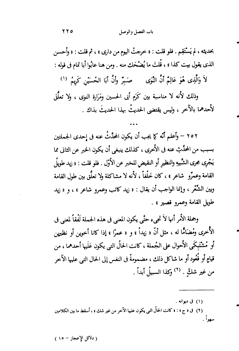 252 - واعلمْ أنه كما يجبُ أن يكونَ المحدَّثُ عنه في إحدى الجملتين بسببٍ من المحدَّثِ عنه في الأخرى، كذلكَ ينبغي أنْ يكونَ الخبرُ عن الثاني مما يَجْرِي مَجْرى الشبيهِ والنظيرِ أو النَّقيضِ للخبر عن الأولِ. فلو قلتَ: "زيدٌ طويلُ القامة وعمرو شاعرٌ"، كان خُلْقاً، لأنه لا مُشاكلَةَ ولا تعلُّق بينَ طولِ القامةِ وبين الشعرِ، وإنما الواجب أن يقال: "زيد كاتب وعمرو شاعر"، و "زيد طويل القامة وعمرو قصيرٌ".