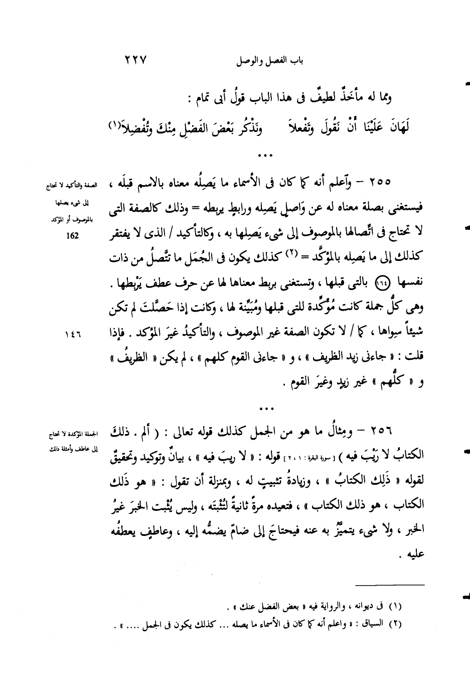 255 - واعلم أنه كماكان من الأسماءِ ما يَصِلهُ معناهُ بالاسم قبلَه، فيستغني بصلة له عن واصلٍ يصلُه ورابطٍ يربِطُه وذلك كالصِّفِة التي لا تحتاجُ في اتِّصالِها بالموصوفِ إلى شيء يصلها به، وكالتأكيد الذي لا يَفتقِرُ كذلك إلى ما يِصلُه بالمؤكَّد2 كذلك يكونُ في الجملِ ما تتصلُ من ذاتِ نفسها بالتي قَبلها، وتَستغني بربطِ معناها لها عن حَرْفِ عطفٍ يربُطها، وهي كلُّ جملةٍ كانت مؤكِّدةً للتي قبلها ومبينِّةً لها، وكانت إذا حُصِّلتْ لم تكن شيئاً سِواها، كما لا تكونُ الصفةُ غيرَ الموصوفِ، والتأكيدُ غيرَ المؤكد. فإذا قلت: "جاءني زيد الظريف"، و "جاءني القوم كلهم"، لم يكن "الظريف" و "كلهم" غير زيد وغير القوم.