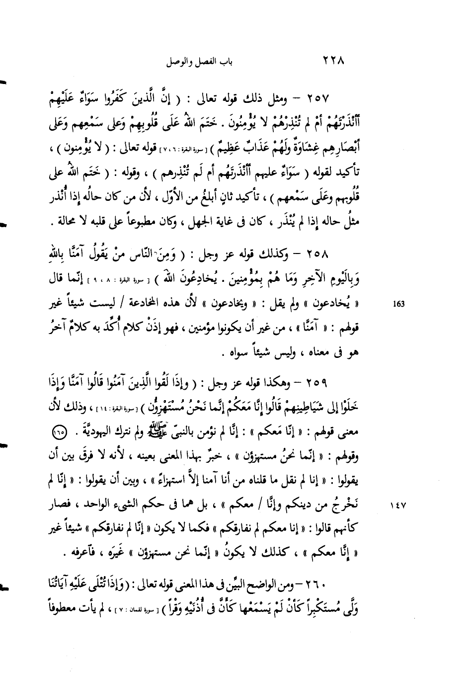 257 - ومثلُ ذلك قولُه تعالى: {إِنَّ الَّذِينَ كَفَرُوا سَوَاءٌ عَلَيْهِمْ أَأَنْذَرْتَهُمْ أَمْ لَمْ تُنْذِرْهُمْ لا يُؤْمِنُونَ، خَتَمَ اللَّهُ عَلَى قُلُوبِهِمْ وَعَلَى سَمْعِهِمْ وَعَلَى أَبْصَارِهِمْ غِشَاوَةٌ وَلَهُمْ عَذَابٌ عَظِيمٌ} [البقرة: 6، 7] قولُه تعالى: {لا يُؤْمِنُونَ}، تأكيدٌ لقولِه: {سَوَاءٌ عَلَيْهِمْ أَأَنْذَرْتَهُمْ أَمْ لَمْ تُنْذِرْهُمْ}، وقولُه: {خَتَمَ اللَّهُ عَلَى قُلُوبِهِمْ وَعَلَى سَمْعِهِمْ}، تأكيدٌ ثانِ أبلغُ من الأول، لأنَّ مَن كان حالُه إذا أنذر مثل حاله إذا لم يندر، كانَ في غايِة الجَهْل، وكان مطبوعاً على قَلْبِه لا محالةَ.