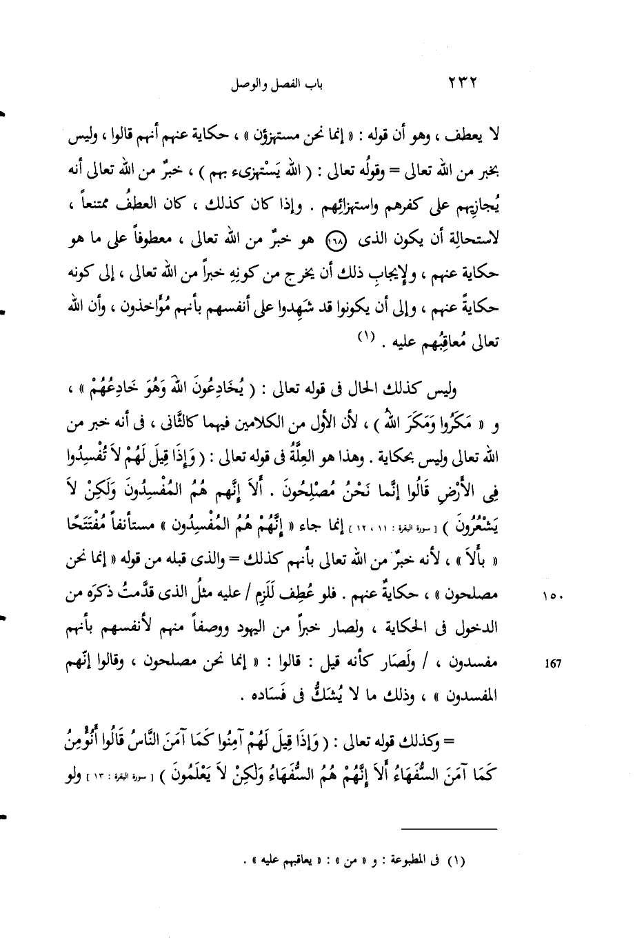 وليس كذلك الحالُ في قولهِ تعالى: {يُخَادِعُونَ اللَّهَ وَهُوَ خَادِعُهُمْ}، و {مَكَرُوا وَمَكَرَ اللَّه}، لأن الأوَّلَ من الكلامَيْنِ فيهما كالثاني، في أنه خَبَرٌ مِنَ الله تعالى ولَيْسَ بحكايةٍ. وهذا هُوَ العِّلةُ في قولِه تعالى: {وَإِذَا قِيلَ لَهُمْ لا تُفْسِدُوا فِي الْأَرْضِ قَالُوا إِنَّمَا نَحْنُ مُصْلِحُونَ، أَلا إِنَّهُمْ هُمُ الْمُفْسِدُونَ وَلَكِنْ لا يَشْعُرُونَ} [البقرة: 11، 12] إنما جاء {إِنَّهُمْ هُمُ الْمُفْسِدُونَ} مُستأنفاً مُفتتحاً "بأَلا"، لأنَّه خبرٌ من الله تعالى بأنهم كذلك والذي قبله من قوله: {إِنَّمَا نَحْنُ مُصْلِحُونَ}، حكاية عنهم. فلو عطف لَلَزِم عليه مثلُ الذي قدَّمتُ ذكرَه منَ الدخولِ في الحكايةِ، ولصارَ خبراً مِنَ اليهودِ ووصفاً مِنْهم لأنفسهم بأنه مُفْسِدون، ولصار كأنه قِيلَ: قالوا: {إِنَّمَا نَحْنُ مُصْلِحُونَ}، وقالوا إنهم المفسِدون، وذلك ما لا يُشَكُّ في فسادِه.