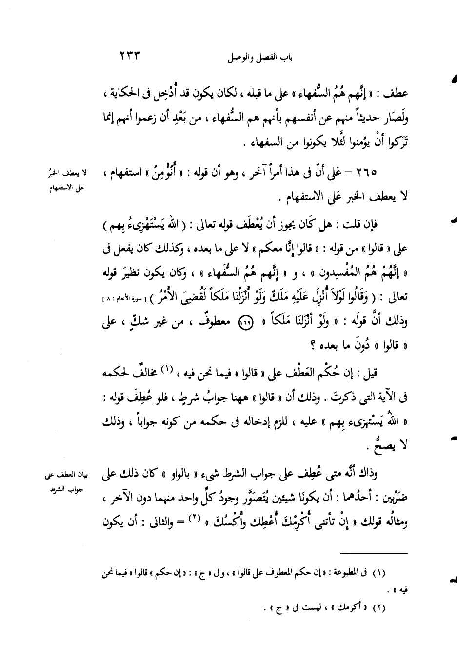 265 - على أن في هذا أمر آخر، وهو أن قوله: {أَنُؤْمنُ} استفهام، لا يُعْطَفُ الخبرُ على الاستفهام.