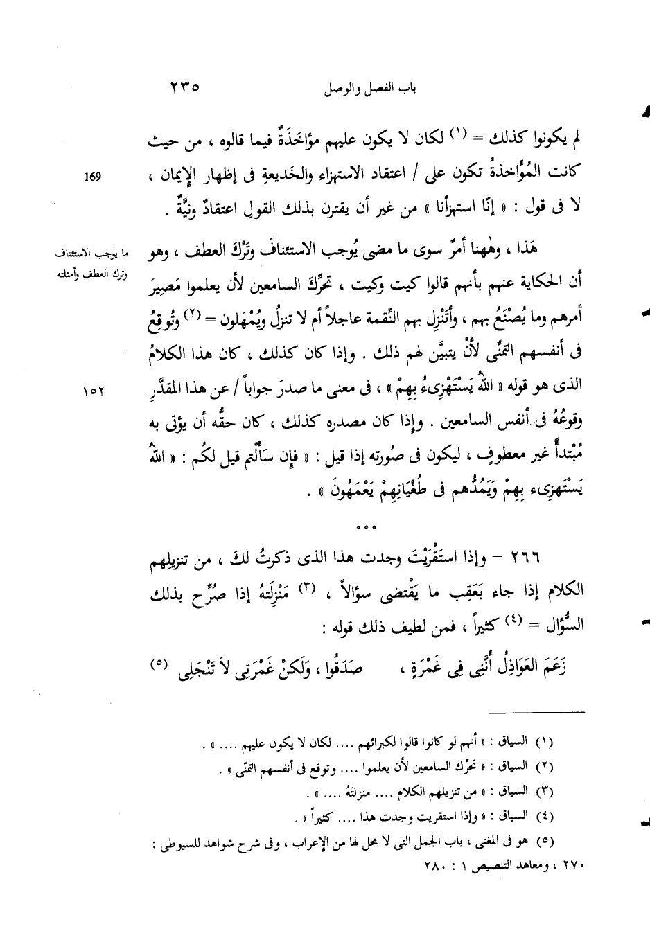 هذا، وههنا أمرٌ سِوَى ما مضَىَ يوجِبُ الاستئنافَ وتركَ العطفِ، وهو أنَّ الحكايةَ عنهم بأنهم قالوا كيتَ وكيتَ، تحرِّكُ السامعين لأن يعلموا مصيرَ أمرهم وما يصنع بهم، وأننزل بِهِمُ النِّقْمةُ عاجلاً أم لا تنزلُ ويُمْهلَونَ2 وتوقع في أنفسهم التمني لأنْ يتبيَّنَ لهم ذلك. وإِذا كان كذلك، كانَ هذا الكلامُ الذي هو قولُه: {اللَّهُ يَسْتَهْزِئُ بِهِمْ}، فيم عنى ما صدر جوابًا عن هذا المقدر مبتدأ غيرَ معطوف، ليكونَ في صورتِهِ إذا قيل: "فإِنْ سألتم قِيلَ لكم": {اللَّهُ يَسْتَهْزِئُ بِهِمْ وَيَمُدُّهُمْ فِي طُغْيَانِهِمْ يَعْمَهُون}.