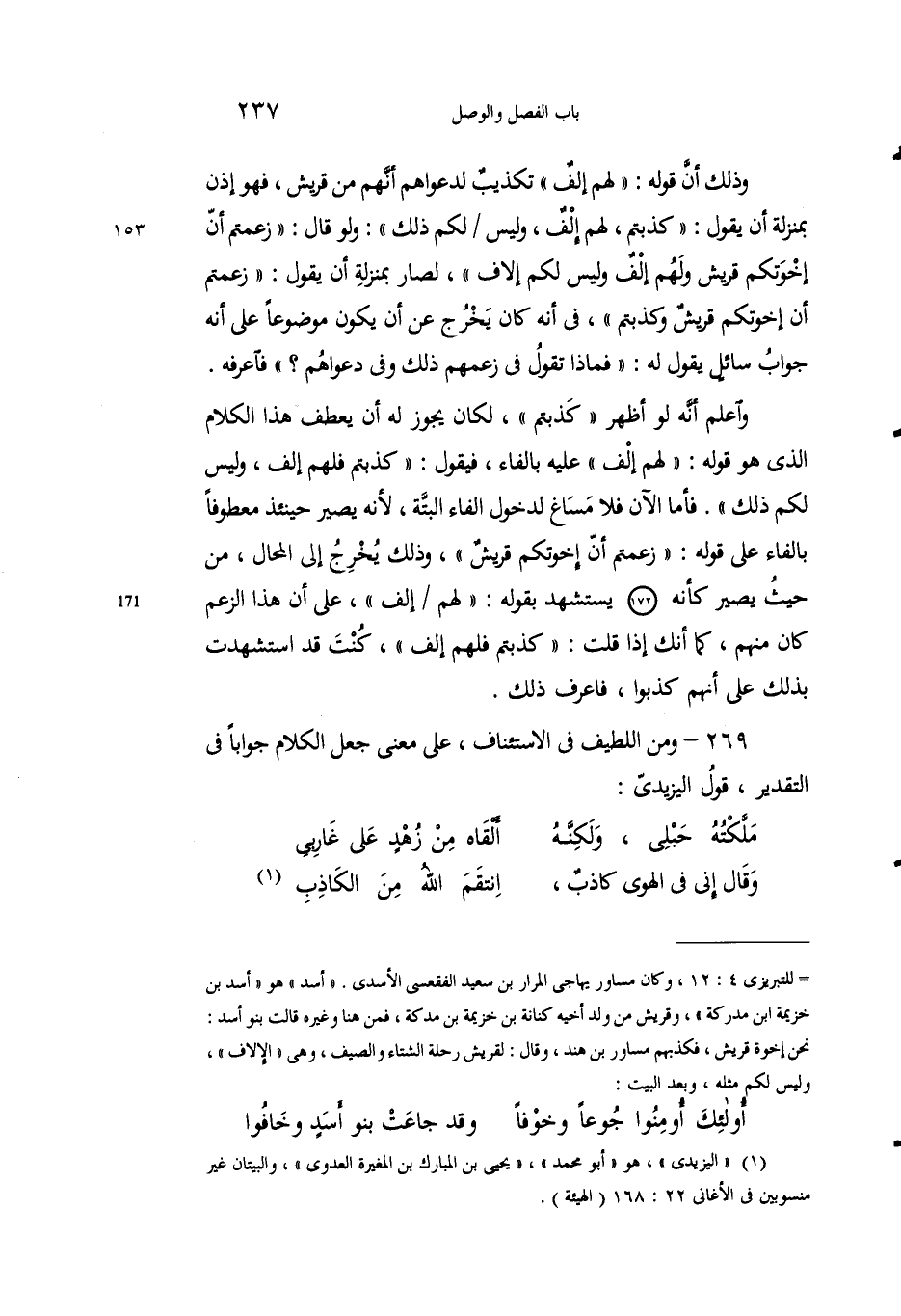 واعلمْ أنه لو أظهرَ "كذَبتْمُ"، لكان يجوزُ له أن يَعْطِفَ هذا الكلامِ الذي هو قولُه: "لهم إلفٌ" عليه بالفاء، فيقول: "كَذَبْتُم فلهم إلفٌ، وليس لكم ذلك" فأما الآنَ فلا مَسَاغَ لدخولِ الفاءِ البتَّةَ، لأنَّه يصيرُ حينئذٍ معطوفاً بالفاء على قولِه: "زَعَمْتُم أن إخوانكم قريش"، وذلك يخرج إلى المجال، مِنْ حيثُ يصير كأَنه يستشهدُ بقوله: "لهم إلفٌ"، على أنَّ هذا الزعمَ كان منهم، كما أنك إذا قلت: "كذبتم فهلم إلفٌ"، كنتَ قد استشهدتَ بذلكَ على أنهمْ كذبوا، فاعرِفْ ذلك.