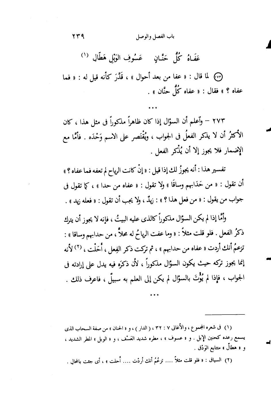 وأما إذا لم يكنِ السُّؤالُ مذكوراً كالذي عليه البيتُ، فإِنَّه لا يجوزُ أن يُتْرَكَ ذكرُ الفعلِ. فلو قلتَ مثلا: "وما عفت الرياح له محلًا، من حدابهم وساقًا" تزعم أنك أردت "عفاه من حدابهم"، ثم ترك ذكرَ الفعلِ، أَحَلْتَ2، لأنه إنَّما يجوزُ تركُه حيثُ يكونُ السؤالُ مذكوراً، لأَن ذكرَه فيه يدلُّ على إرادتِه في الجوابِ، فإِذا لم يوت بالسُّؤالِ لم يكن إلى العلم بهِ سبيلٌ، فاعرف ذلك.