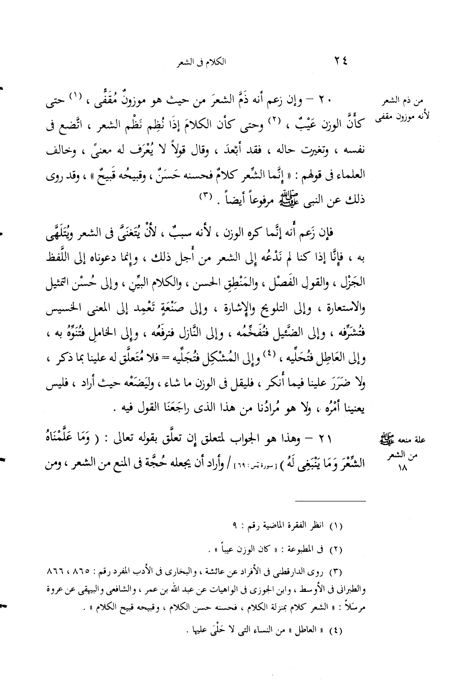 21 - وهذا هو الجوابُ لمتُعلِّقٍ إنْ تَعَلَّق بقولِهِ تعالى: {وَمَا عَلَّمْنَاهُ الشِّعْرَ وَمَا يَنْبَغِي لَه} [سورة يس: 69] وأرادَ أن يَجْعله حُجةً في المَنْع منَ الشعر، ومن