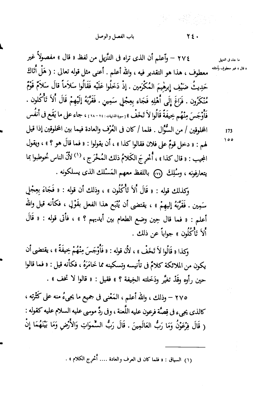 274 - واعلم أنَّ الذى تراهُ في التنزيلِ من لفظِ "قال" مَفصولاً غيرَ معطوف، هذا هو التقديرُ فيه، واللهُ أعلم. أعني مثلَ قولِه تعالى: {هَلْ أَتَاكَ حَدِيثُ ضَيْفِ إِبْرَاهِيمَ الْمُكْرَمِينَ، إِذْ دَخَلُوا عَلَيْهِ فَقَالُوا سَلامًا قَالَ سَلامٌ قَوْمٌ مُنْكَرُونَ، فَرَاغَ إِلَى أَهْلِهِ فَجَاءَ بِعِجْلٍ سَمِينٍ، فَقَرَّبَهُ إِلَيْهِمْ قَالَ أَلا تَأْكُلُونَ، فَأَوْجَسَ مِنْهُمْ خِيفَةً قَالُوا لا تَخَفْ} [الذاريات: 24 - 28]، جاء على ما يقعُ في أنفسِ المخلوقين منَ السُّؤال. فلما كان في العُرفِ والعادةِ فيما بينَ المخلوقينَ إذا قيل لهم: "دخلَ قوم على فلان فقالوا كذا"، أخرجَ الكلامَ ذلك المُخْرجَ1، لأنَ الناسَ خوطبوا بما يتعارفونه، وسلك باللظف معهم المَسْلكُ الذي يَسْلُكُونه.