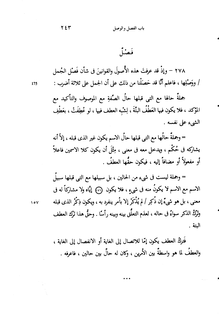 278 - وإذْ قد عَرْفت هذه الأصولَ والقوانينَ في شأنِ فَصْل الجُملِ ووَصْلها، فاعلمْ أنَّا قد حصَلْنا من ذلك على أنَّ الجُمَل على ثلاث أضربِ: