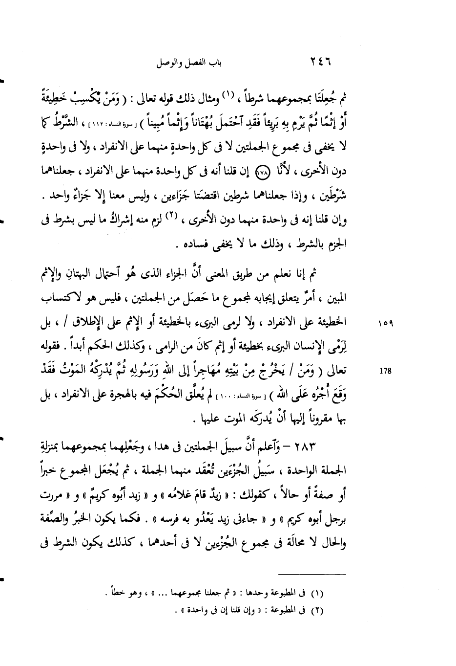 ثم إنا نعلم من طريق المعنى أن الجزء الذي هو احتمالُ البهتانِ والإِثمِ المبينِ، أمرٌ يتعلَّقُ إيجابُه لمجموعِ ما حصلَ منَ الجملتين، فليس هو لاكتساب الخطيئةِ على الانفرادِ، ولا لرمي البرئ بالخَطيئةِ أو الإِثم على الإِطلاق، بل لِرمْي الإنسان البرئ بخطيئةٍ أو إثمٍ كانَ مِنَ الرامي، وكذلك الحكْمُ أبداً. فقولُه تعالى: {وَمَنْ يَخْرُجْ مِنْ بَيْتِهِ مُهَاجِرًا إِلَى اللَّهِ وَرَسُولِهِ ثُمَّ يُدْرِكْهُ الْمَوْتُ فَقَدْ وَقَعَ أَجْرُهُ عَلَى اللَّهِ} [النساء: 100] لم يُعلَّقِ الحكْمُ فيه بالهجرةِ على الانفراد، بل بها مَقْروناً إليها أنْ يُدرِكَهُ الموتُ عليها.