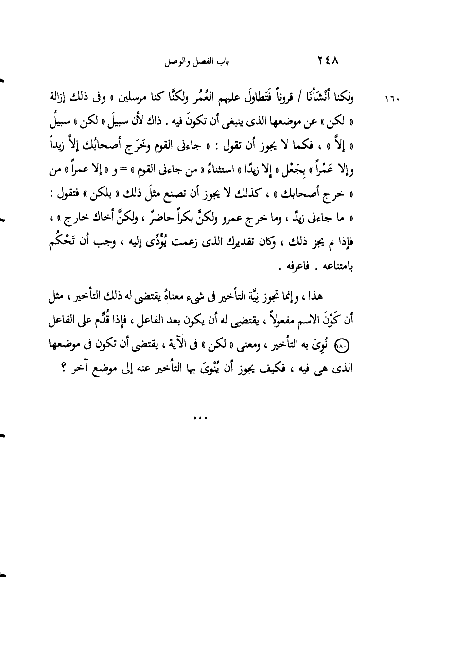 ولكنا أنشأْنا قروناً فتطاولَ عليهم العمرُ ولكنَّا كنا مُرسِلين" وفي ذلك إزالةُ "لكنَّ" عن موضِعِها الذي ينبغي أن تكونَ فيه. ذاك لأنَّ سبيلَ "لكنَّ" سبيلُ "إلاَّ"، فكَما لا يجوز أن تقولَ: "جاءني القومُ وخرَجَ أصحابُكَ إلا زيدًا وإلا عمرصا" يجعل "إلا زيدًا" استثناء من جانءي القوم" و "إلا عمراً" من "خرج أصحابُك"، كذلك لا يجوز أن تصنعَ مثلَ ذلك "بلكن" فتقول: "ما جاءني زيدٌ، وما خرجَ عمرُو ولكنَّ بكراً حاضرٌ، ولكنَّ أخاكَ خارجٌ"، فإِذا لم يَجُزْ ذلك، وكان تقديُركَ الذي زعمتَ يؤدِّي إليه، وجَبَ أن تَحْكُم بامتناعه. فاعرفْه.