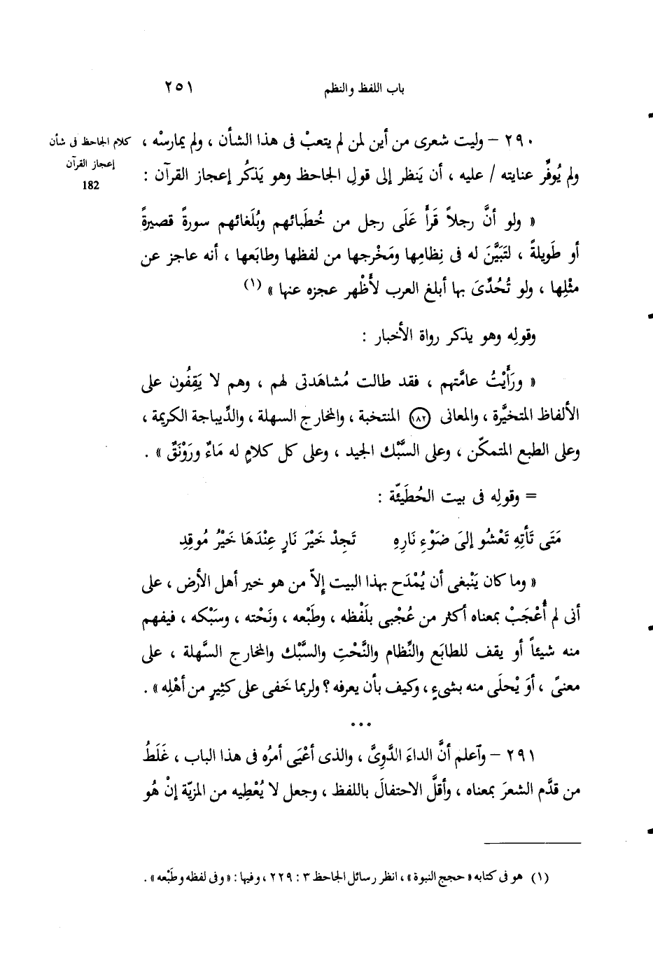 290 - وليتَ شِعْري مِنْ أينَ لِمَنْ لَمْ يتْعَبْ في هذا الشأن، ولم يمارسْه، ولم يوفرْ عنايَتَه، عليه، أنْ يَنْظُرَ إلى قولِ الجاحظِ وهو يذكر عجاز القرآن: