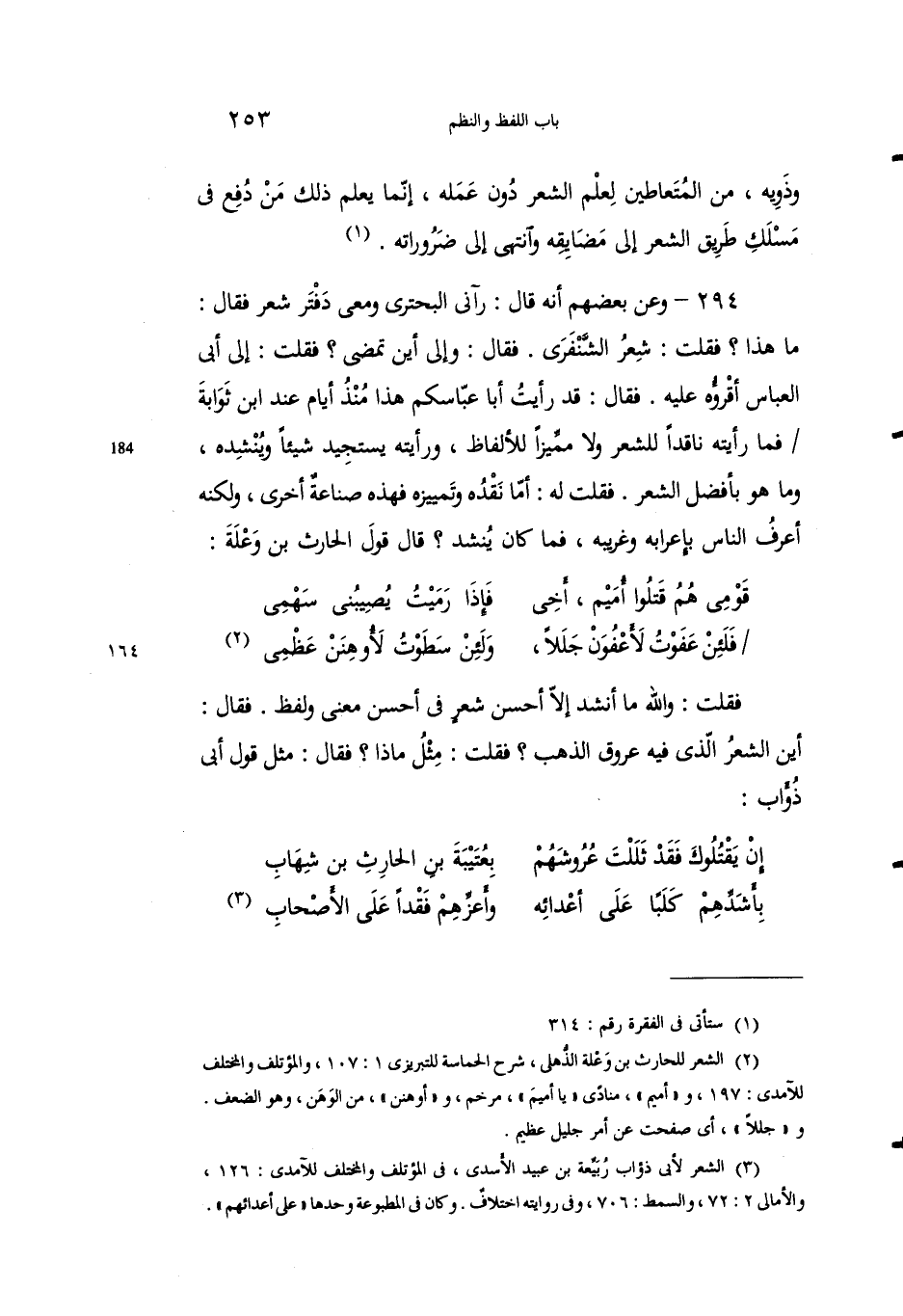 294 - وعن بعضِهم أنه قال: رآني البحتري ومعي دفترُ شعرٍ فقال: ما هذا؟ فقلتُ: شعرَ الشَّنفرى. فقال: وإلى أينَ تَمْضي؟ فقلتُ: إلى أبي العباس أقرؤه عليه. فقال: قد رأيتُ أَبا عبَّاسِكم هذا منذُ أيامٍ عندَ ابنِ ثَوَابة فما رأيتُه ناقداً للشعرِ ولا مُميزاً للألفاظِ، ورأيتُه يَستجيد شيئاً ويُنشِدُه، وما هو بأَفضَلِ الشعر. فقلتُ له: أمَّا نَقْدُه وتَمييزُه فهذه صناعةٌ أُخرى، ولكنَّه أعرفُ الناس بإِعرابهِ وغَريبهِ، فما كان يُنْشِدُ؟ قالَ قولَ الحارثِ بنِ وَعْلَة: