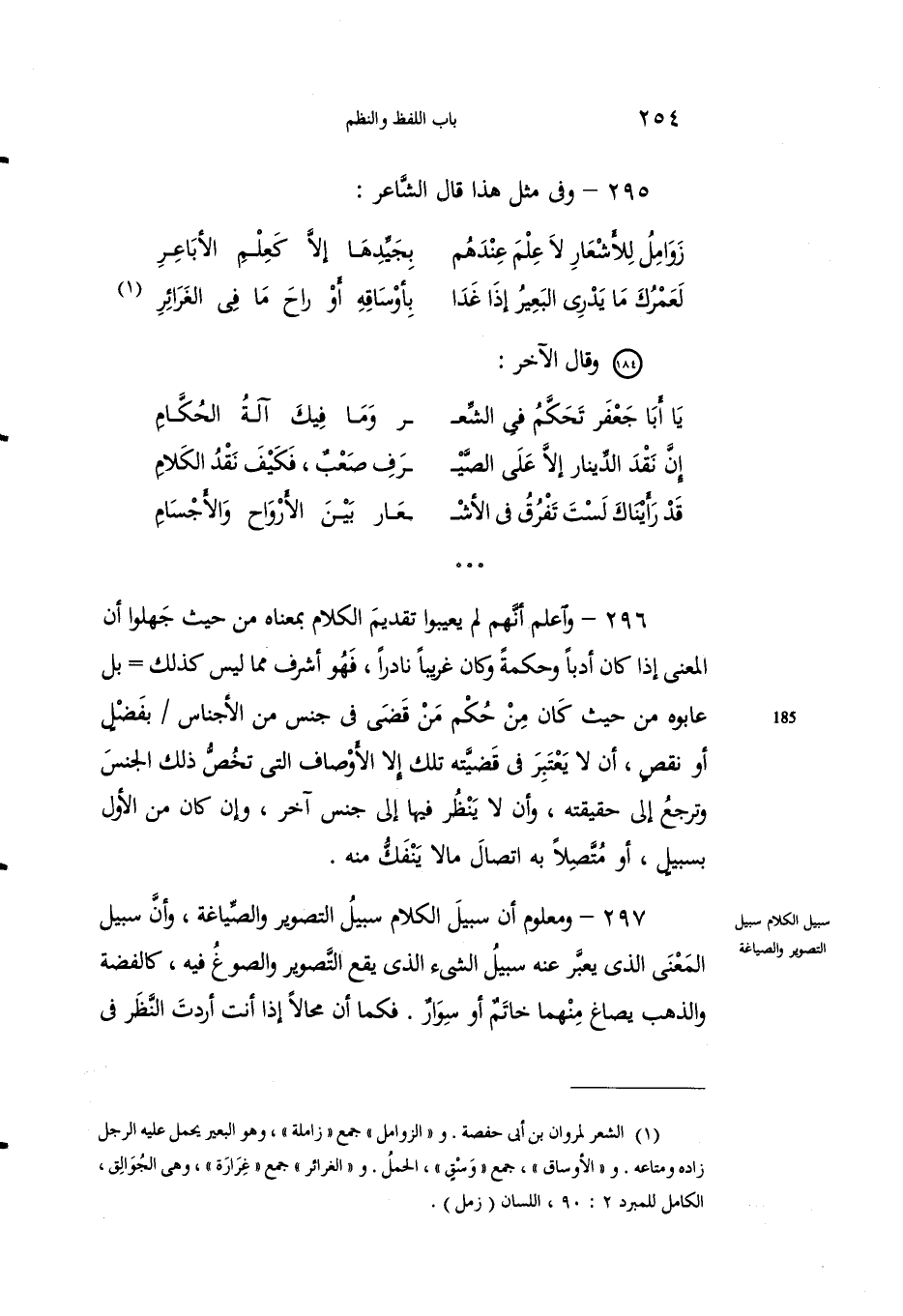 296 - واعلْمْ أَنَّهم لم يَعيبوا تقديمَ الكلام بمعناه من حيثُ جَهِلوا أنَّ المعنى إذا كان أدباً وحكْمةً وكان غَريباً نادراً، فَهو أَشَرَفُ مما ليس كذلكَ بل عابوه مِن حيثُ كان مِنْ حُكْمِ مَنْ قَضى في جنسٍ من الأجناسِ بفضلٍ أو نقصٍ، أنْ لا يَعْتبرَ في قَضِيَّتِهِ تلك إلى الأوصافَ التي تَخصُّ ذلك الجنسَ وتَرْجعُ إلى حقيقته، وأن لا ينظر يها إلى جنس آخر، وإن كان من الأولى بسبيلٍ، أو متصلاً به اتصالَ ما لا ينفك منه.