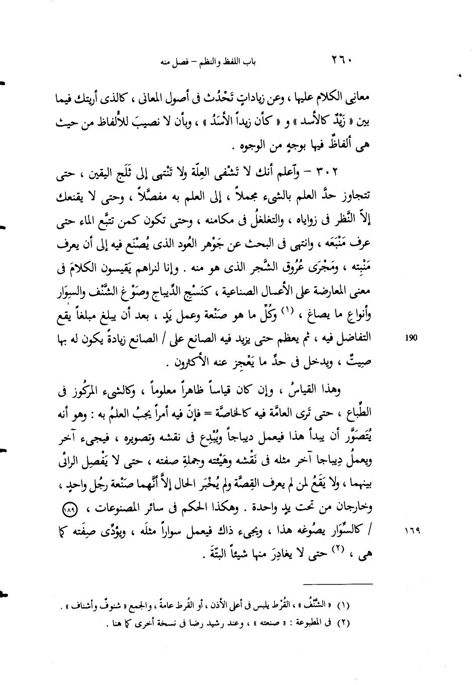 302 - واعلمْ أنك لا تَشْفي الغُلَّة ولا تنْتهي إِلى ثلجِ اليقينِ، حتى تتجاوزَ حدَّ العلمِ بالشيء مجْملاً، إِلى العِلْم به مفصَّلاً، وحتَّى لا يُقْنِعَك إِلاّ النظرُ في زواياهُ، والتَّغلغلُ في مكامنه، وحتى تكون كمَنْ تتَبَّع الماءَ حتى عرَفَ منْبَعهَ، وانتهى في البحثِ عن جوهرِ العُود الذي يُصْنَع فيه إِلى أنْ يعْرِفَ منْبِتَه، ومَجرى عُروقِ الشجرِ، الذي هو منه، وإنَّا لنراهُم يقيسونَ الكلامَ في معنى المعارَضة على الأعمالِ الصناعيةِ، كنَسْج الديباجِ وصَوْغِ الشَّنْفِ والسِّوَار وأنواعِ ما يُصاغُ1، وكلِّ ما هو صَنْعةٌ وعملُ يَدٍِ، بعد أن يَبلُغَ مبلغاًً يقعُ التفاضُلُ فيه، ثم يَعظُم حتى يَزيدَ فيه الصانعُ على الصانِع زيادةً يكونُ له بها صيتٌ، ويدخُلُ في حدِّ ما يَعْجَزُ عنه الأكثرونَ.